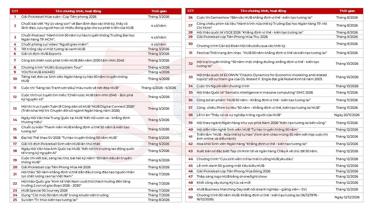 Hướng tới kỷ niệm 50 năm thành lập, Trường Đại học Ngân hàng TP. Hồ Chí Minh triển khai chuỗi 50 sự kiện với chủ đề “Chào mừng 50 năm HUB: Khẳng định vị thế- Kiến tạo tương lai”, gồm các sự kiện: (Chi tiết)