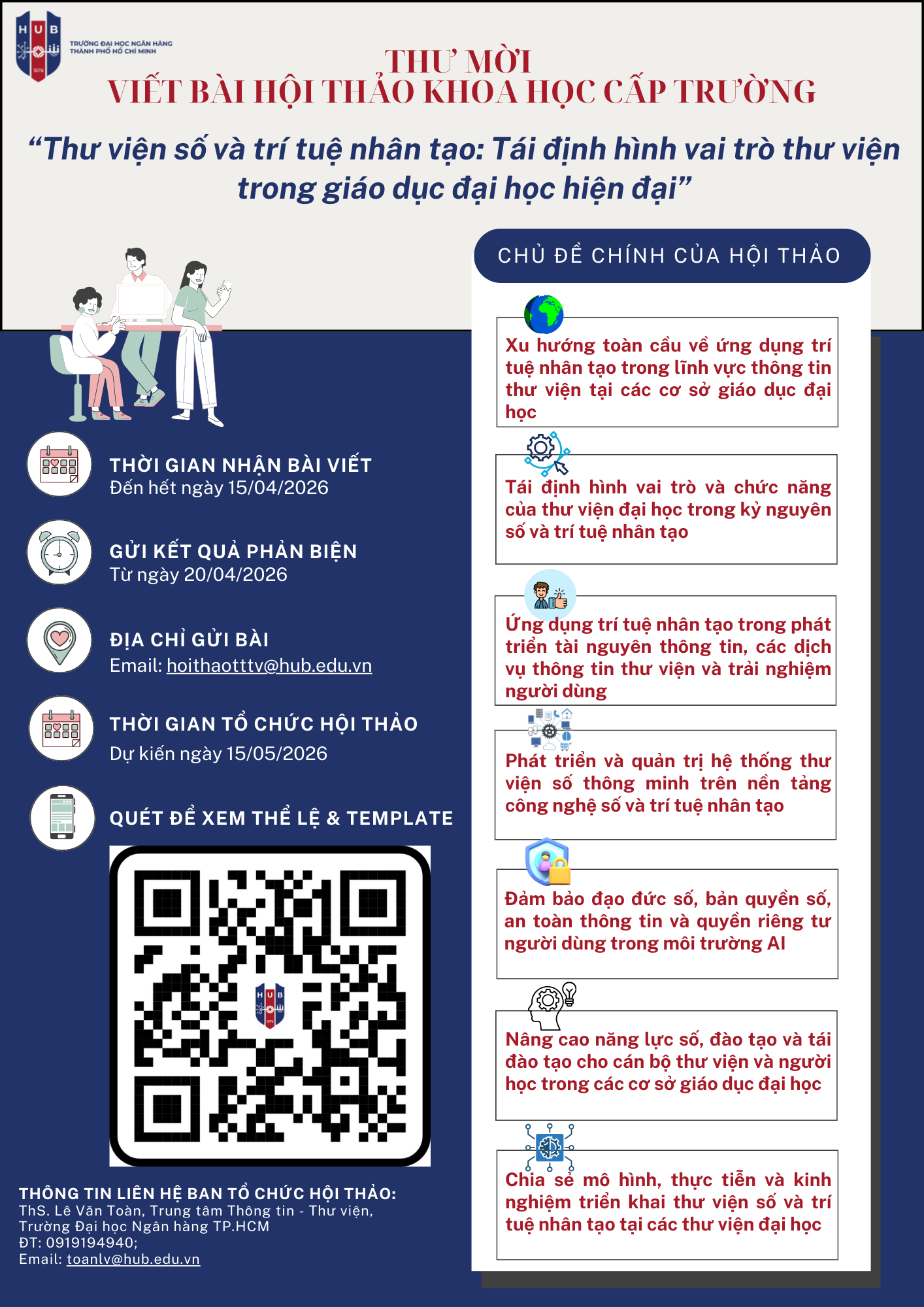 Nhằm tạo diễn đàn học thuật để trao đổi xu hướng, chia sẻ kinh nghiệm thực tiễn và đề xuất các mô hình phát triển thư viện phù hợp với yêu cầu của giáo dục đại học hiện đại, Trung tâm Thông tin – Thư viện Trường Đại học Ngân hàng TP. Hồ Chí Minh tổ chức Hội thảo khoa học cấp Trường với chủ đề nêu trên và trân trọng kính mời các nhà khoa học, nhà nghiên cứu, nhà quản lý, giảng viên và các cá nhân quan tâm gửi bài tham luận. (Chi tiết)