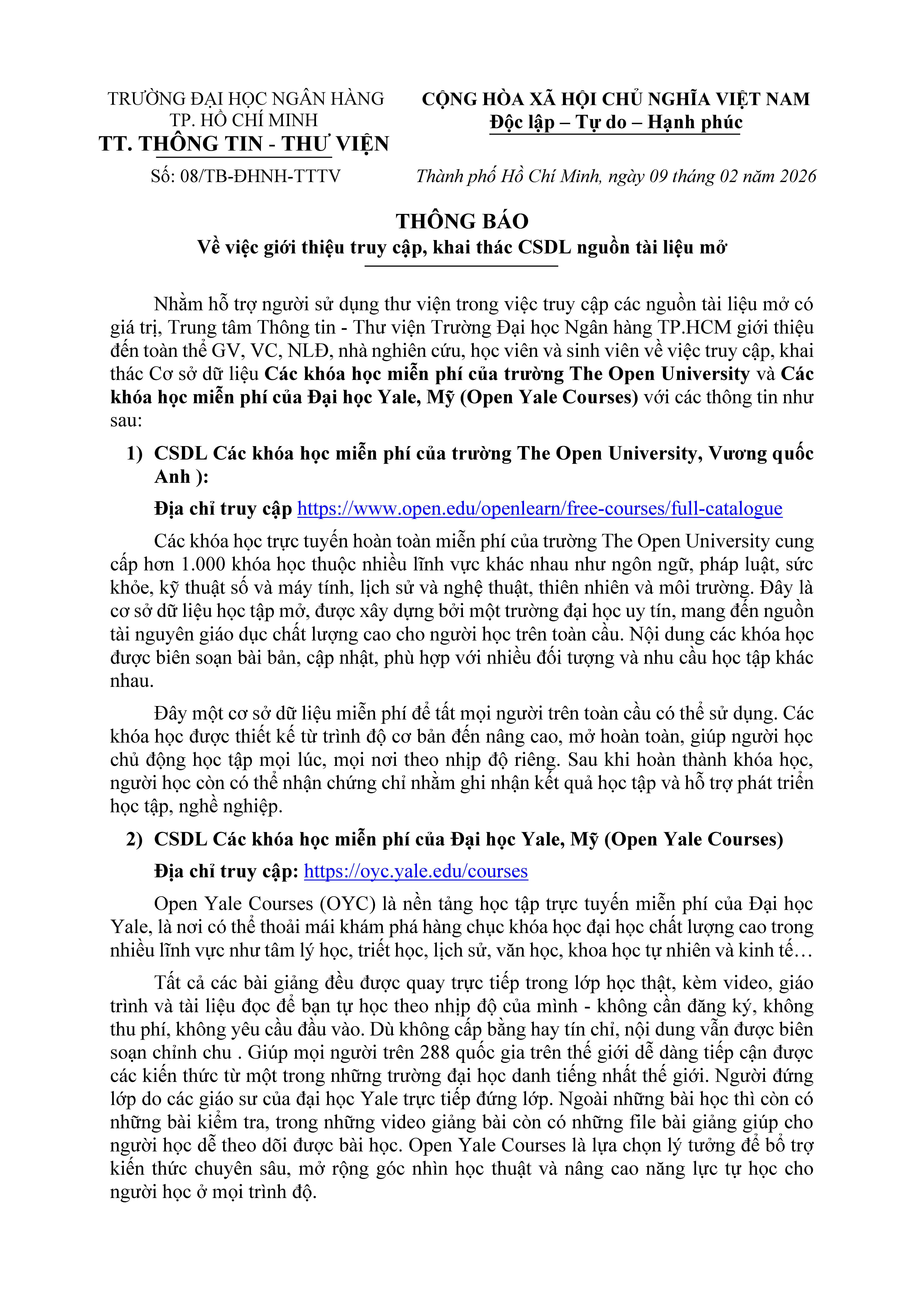 Trung tâm Thông tin - Thư viện Trường Đại học Ngân hàng TP.HCM (TTTV) xin thông báo, tài khoản thư viện đã được cấp và kích hoạt thành công cho các Giảng viên/Viên chức/Người lao động HUB đợt tháng 10/2025 – 01/2026. Dưới đây là một số thông tin cụ thể: (Chi tiết)