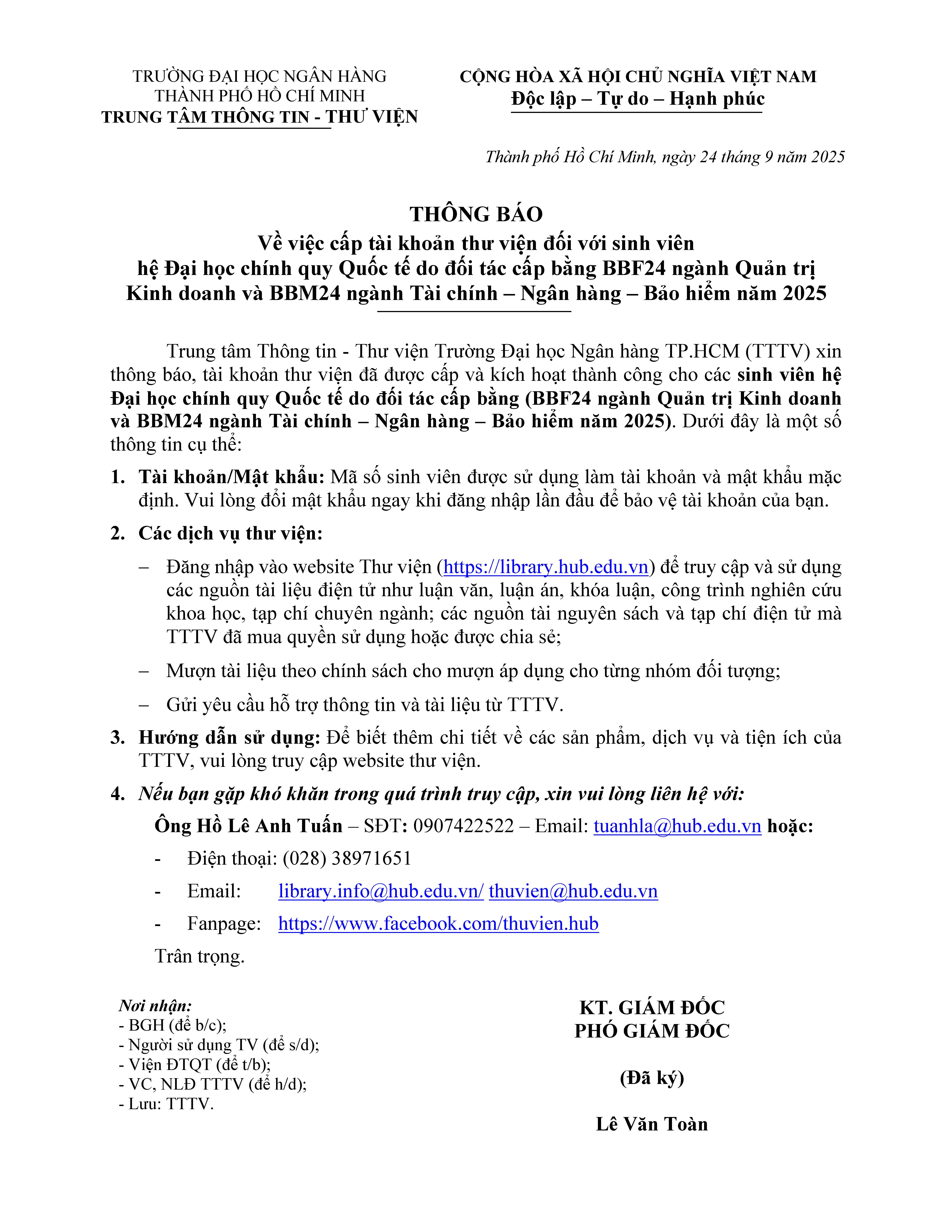 Trung tâm Thông tin - Thư viện Trường Đại học Ngân hàng TP.HCM (TTTV) xin thông báo, tài khoản thư viện đã được cấp và kích hoạt thành công cho các sinh viên hệ Đại học chính quy Quốc tế do đối tác cấp bằng BBF24 ngành Quản trị Kinh doanh và BBM24 ngành Tài chính – Ngân hàng – Bảo hiểm năm 2025. Dưới đây là một số thông tin cụ thể: (chi tiết)