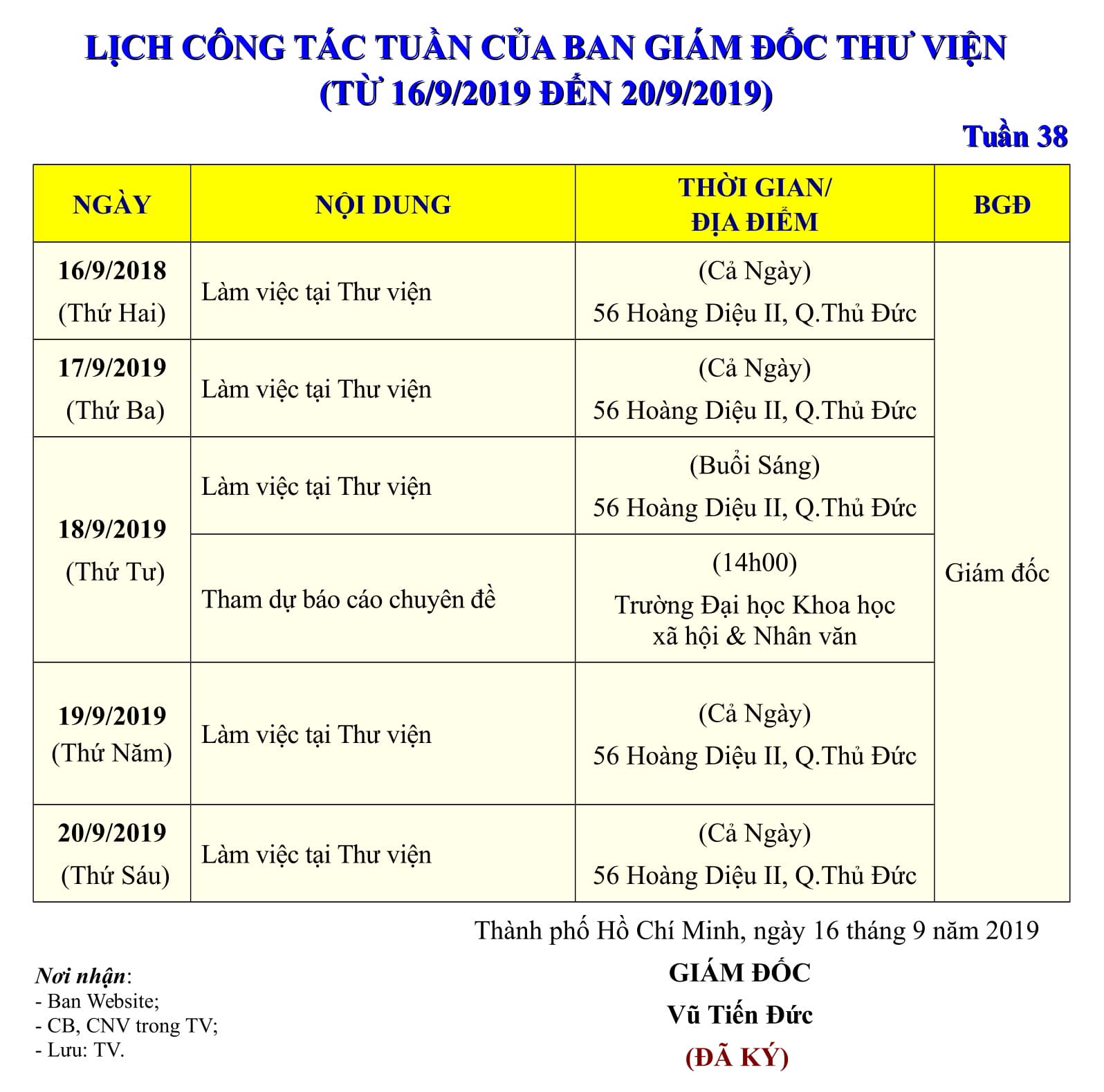Lịch công tác tuần 38 của Ban Giám đốc Thư viện (từ 16/9/2019 đến 20/9/2019)