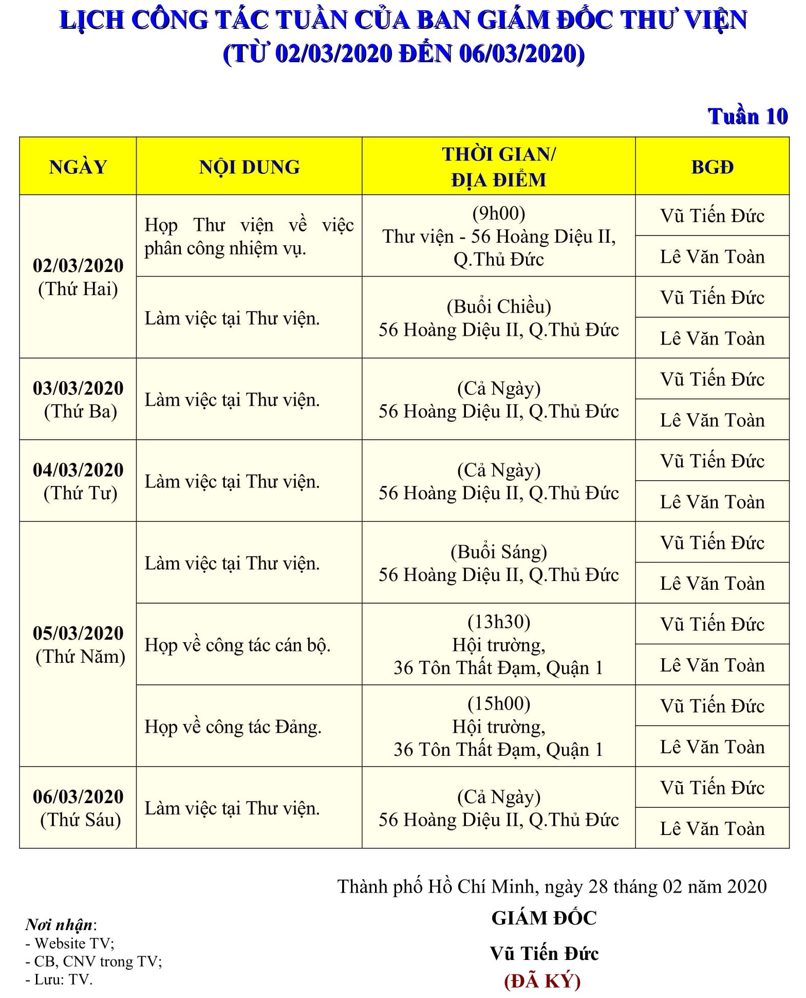 Lịch công tác tuần 10 của Ban Giám đốc Thư viện (từ 02/03/2020 đến 06/03/2020)