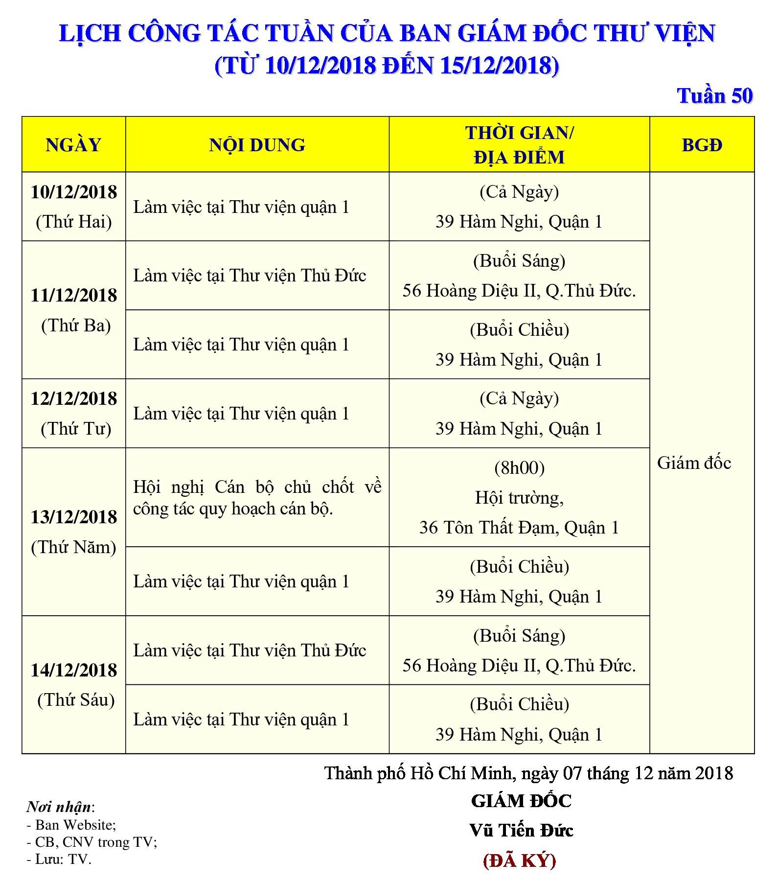 Lịch công tác tuần 50 của Ban Giám đốc Thư viện (từ 10/12/2018 đến 15/12/2018)
