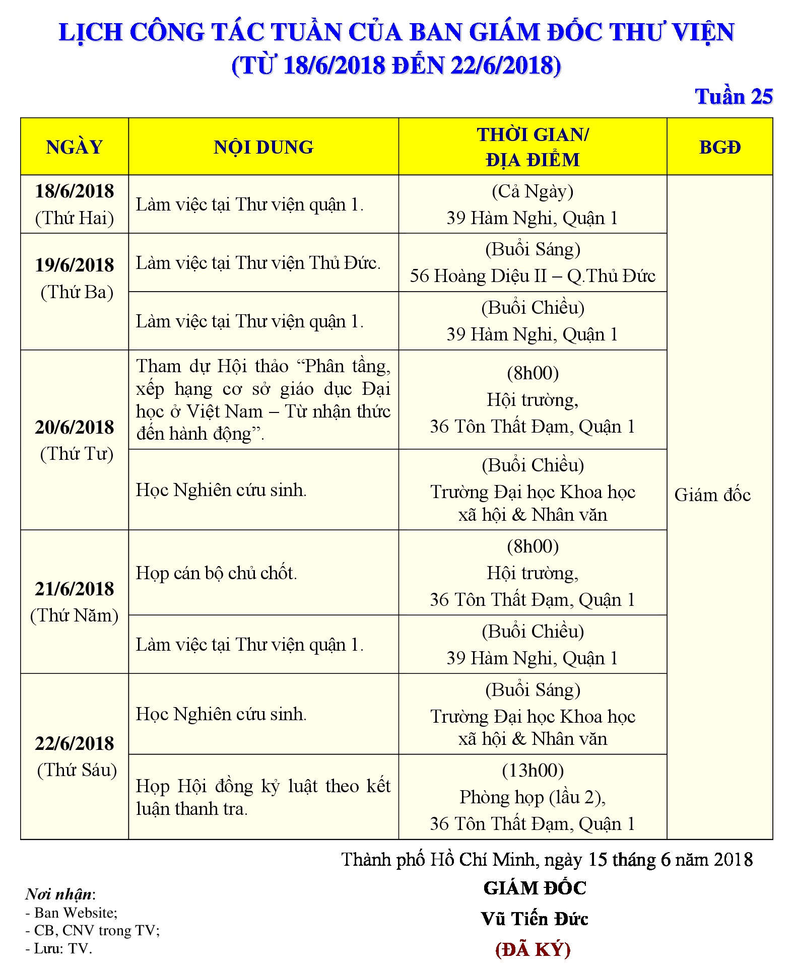 Lịch công tác tuần 25 của Ban Giám đốc Thư viện (từ 18/6/2018 đến 22/6/2018)