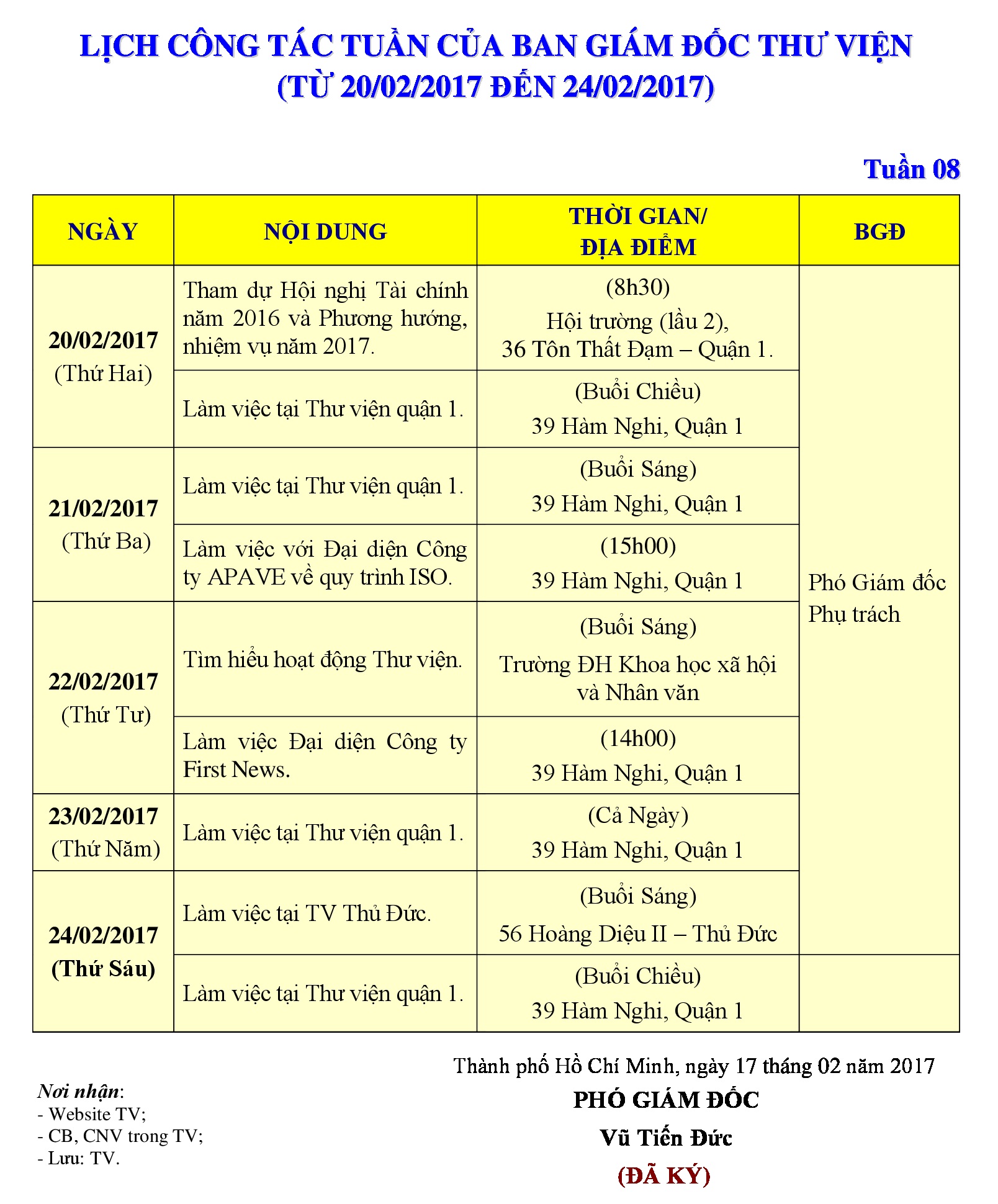 Lịch công tác tuần 08 của Ban Giám đốc Thư viện (từ 20/02/2017 đến 24/02/2017)