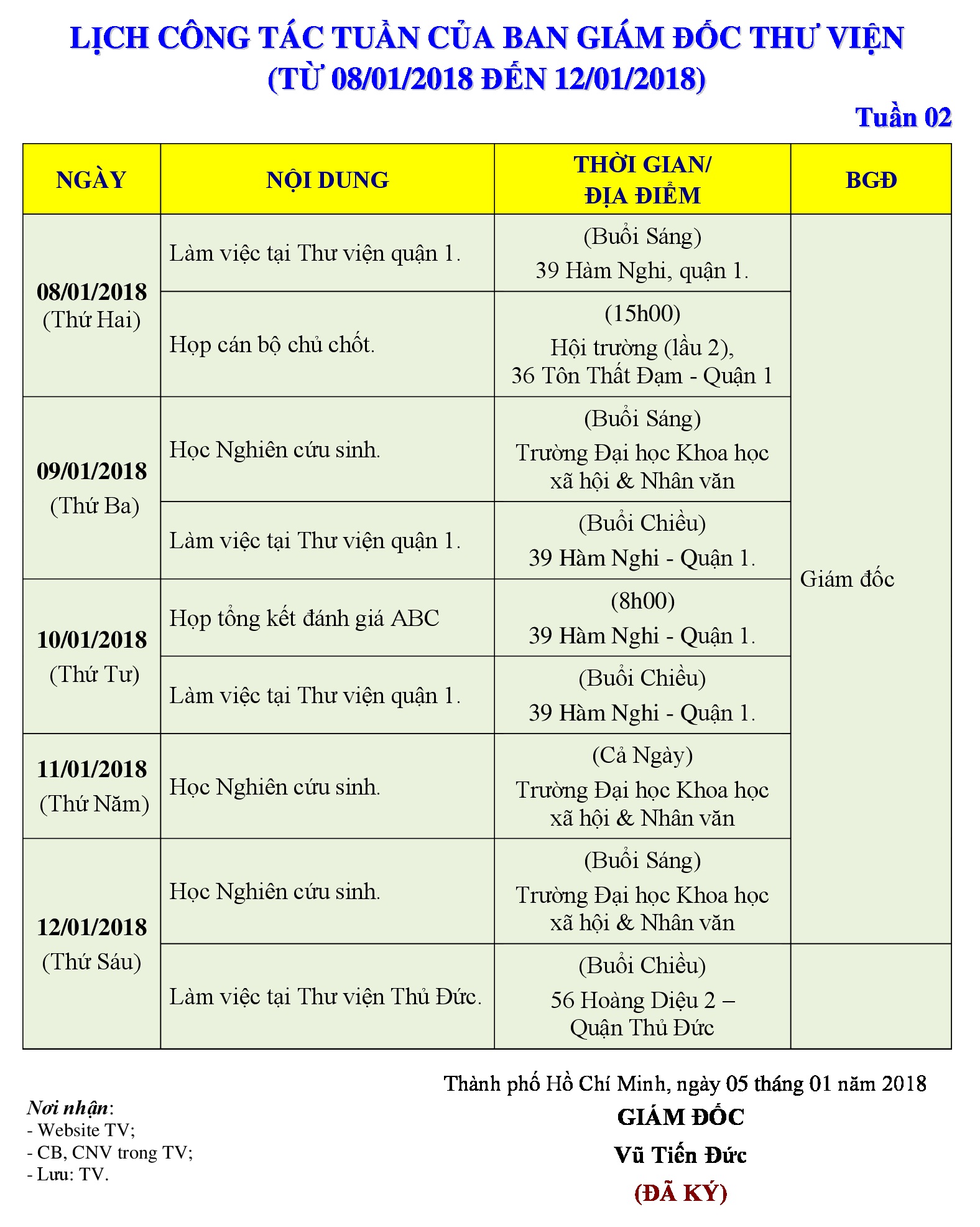 Lịch công tác tuần 02 của Ban Giám đốc Thư viện (từ 08/01/2018 đến 12/01/2018)