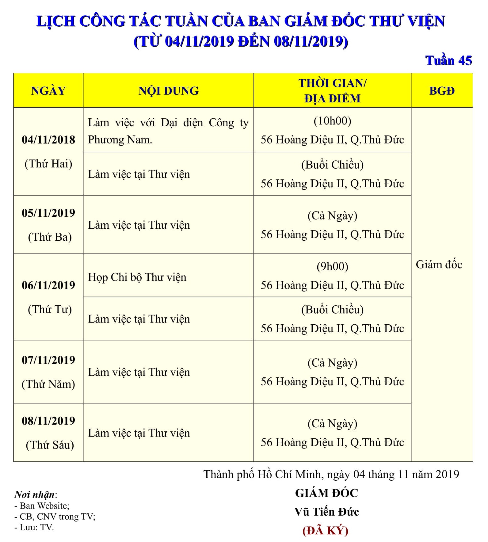 Lịch công tác tuần 45 của Ban Giám đốc Thư viện (từ 04/11/2019 đến 08/11/2019)