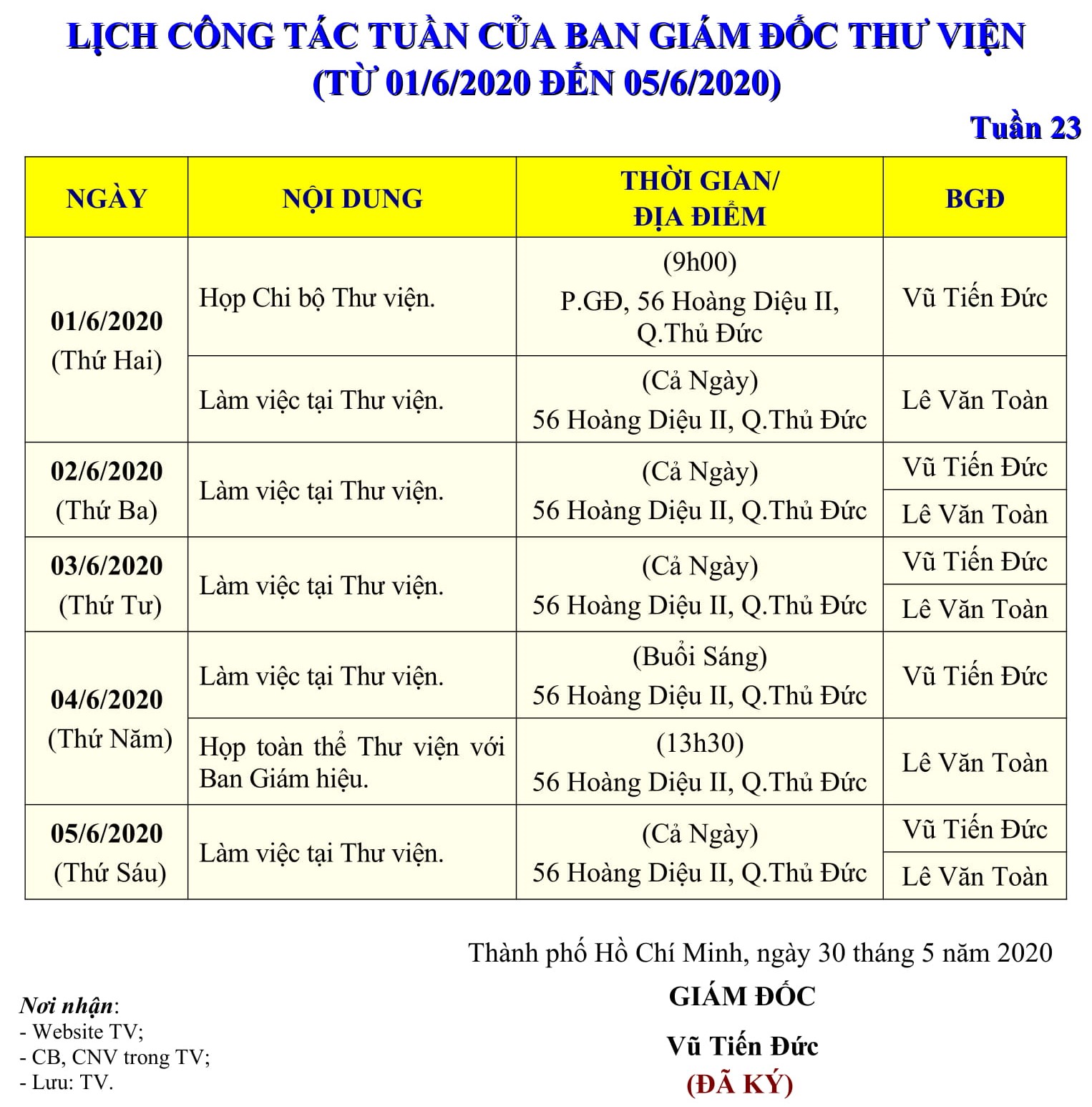 Lịch công tác tuần 23 của Ban Giám đốc Thư viện (từ 01/6/2020 đến 05/6/2020)