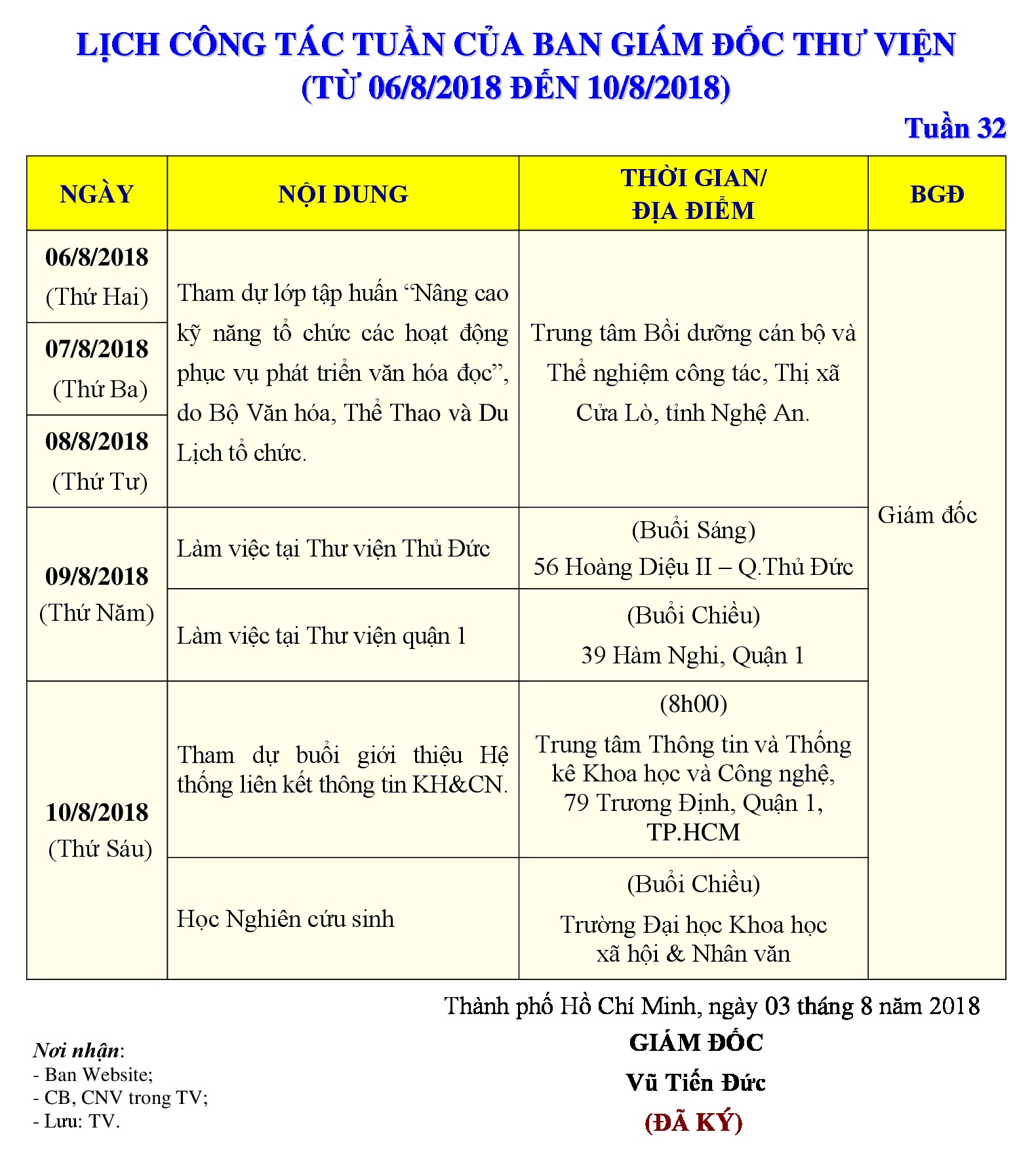 Lịch công tác tuần 32 của Ban Giám đốc Thư viện (từ 06/8/2018 đến 10/8/2018)