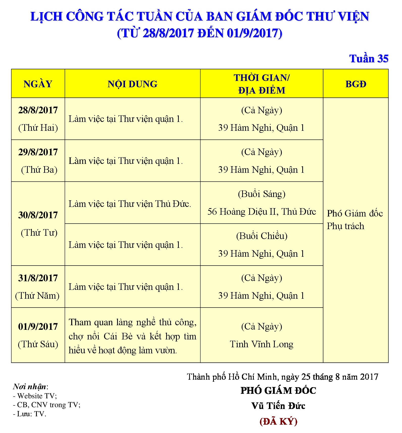 Lịch công tác tuần 35 của Ban Giám đốc Thư viện (từ 28/8/2017 đến 01/9/2017)