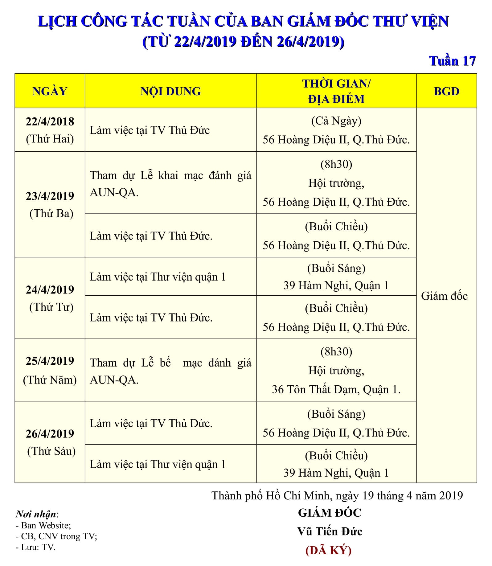 Lịch công tác tuần 17 của Ban Giám đốc Thư viện (từ 22/4/2019 đến 26/4/2019)