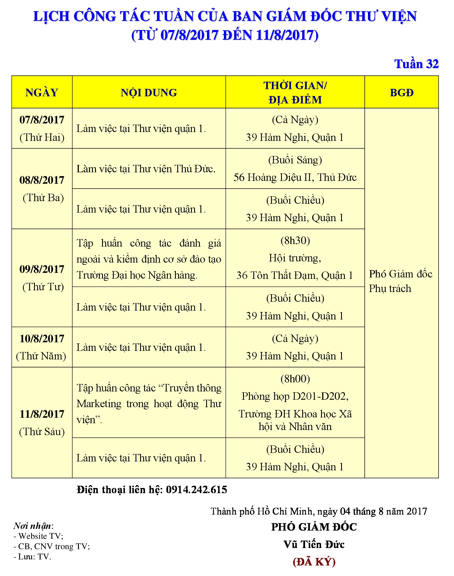 Lịch công tác tuần 32 của Ban Giám đốc Thư viện (từ 07/8/2017 đến 11/8/2017)