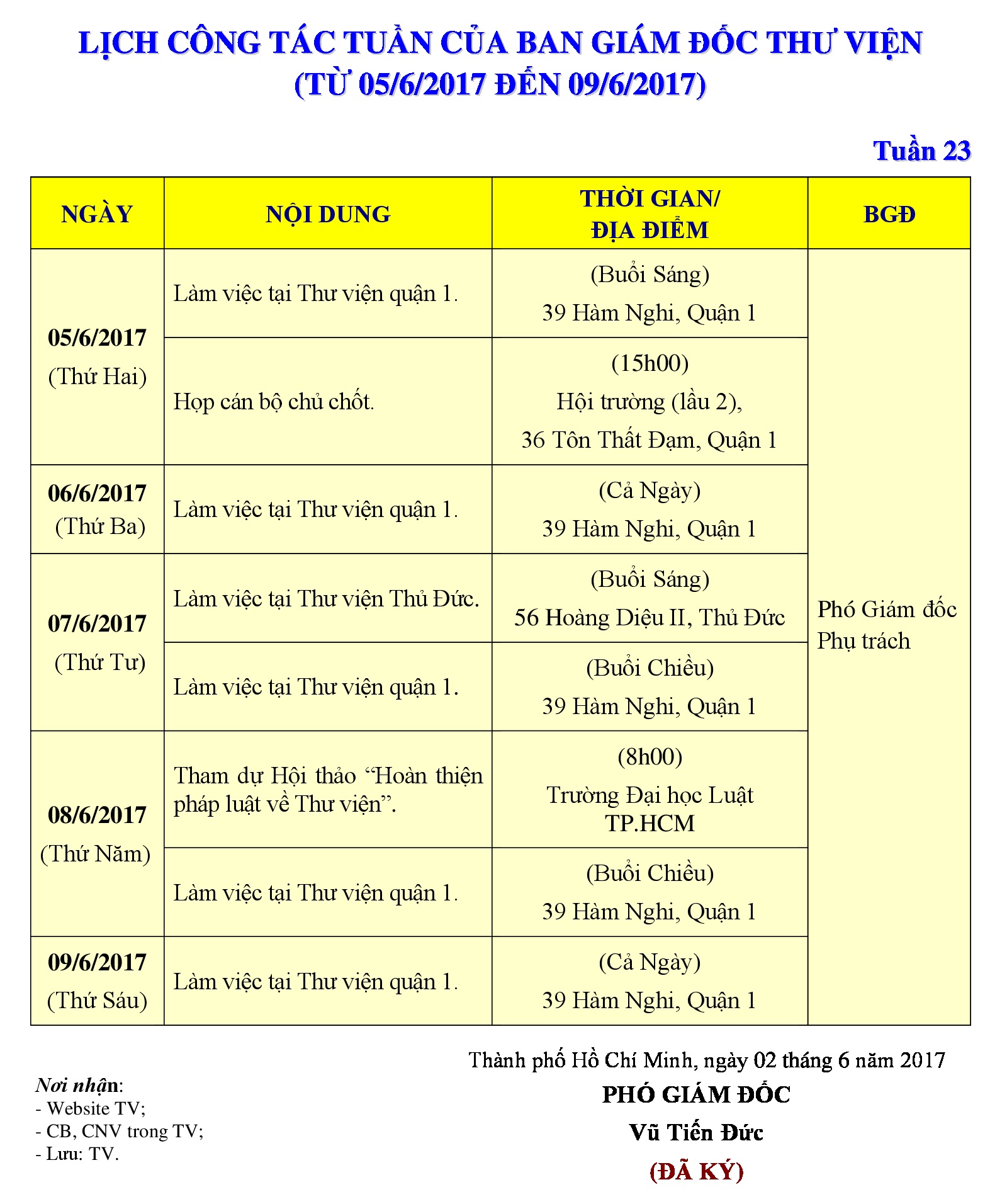 Lịch công tác tuần 23 của Ban Giám đốc Thư viện (từ 05/6/2017 đến 09/6/2017)