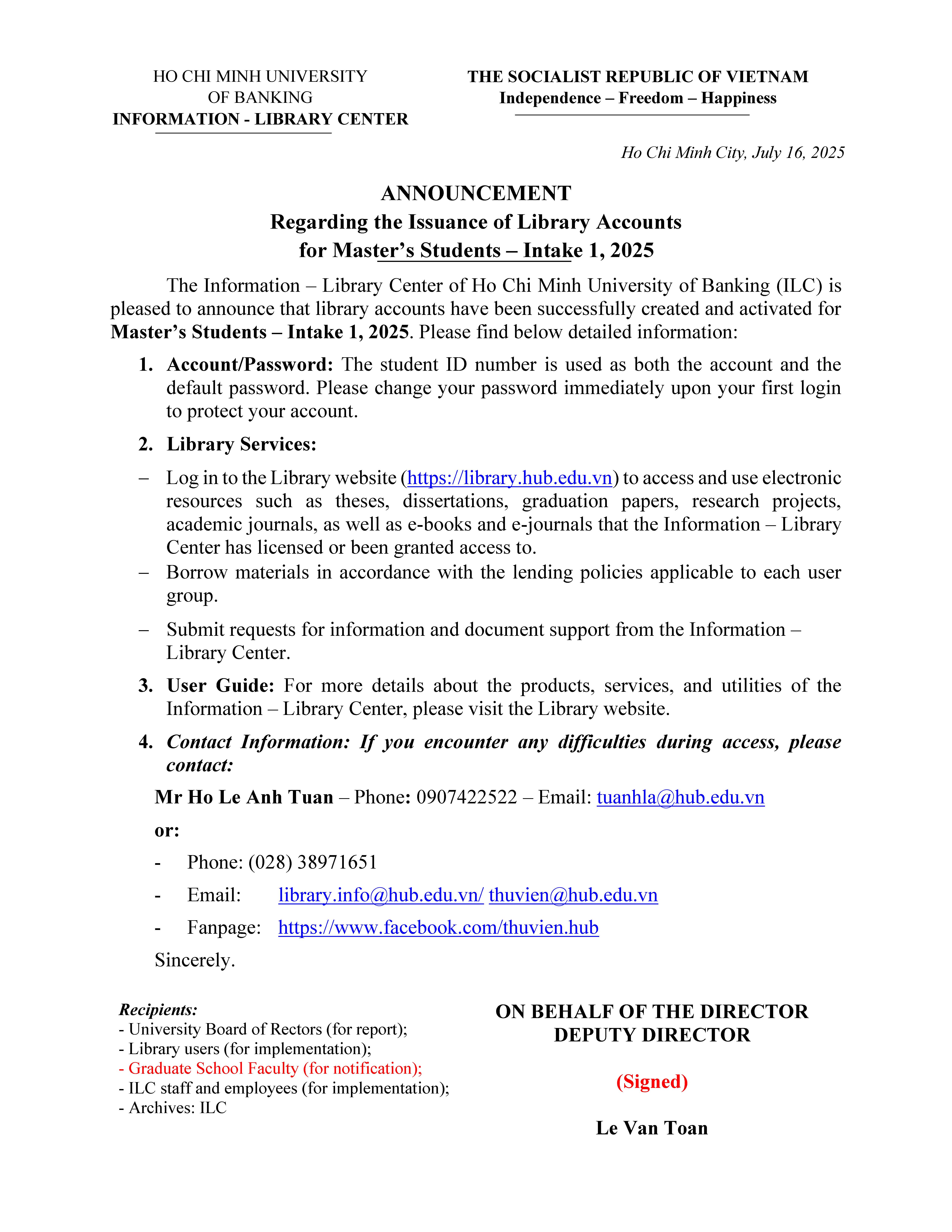 The Information – Library Center of Ho Chi Minh University of Banking (ILC) would like to announce that library accounts have been successfully issued and activated for Master’s Students – Intake 1, 2025. (Details)