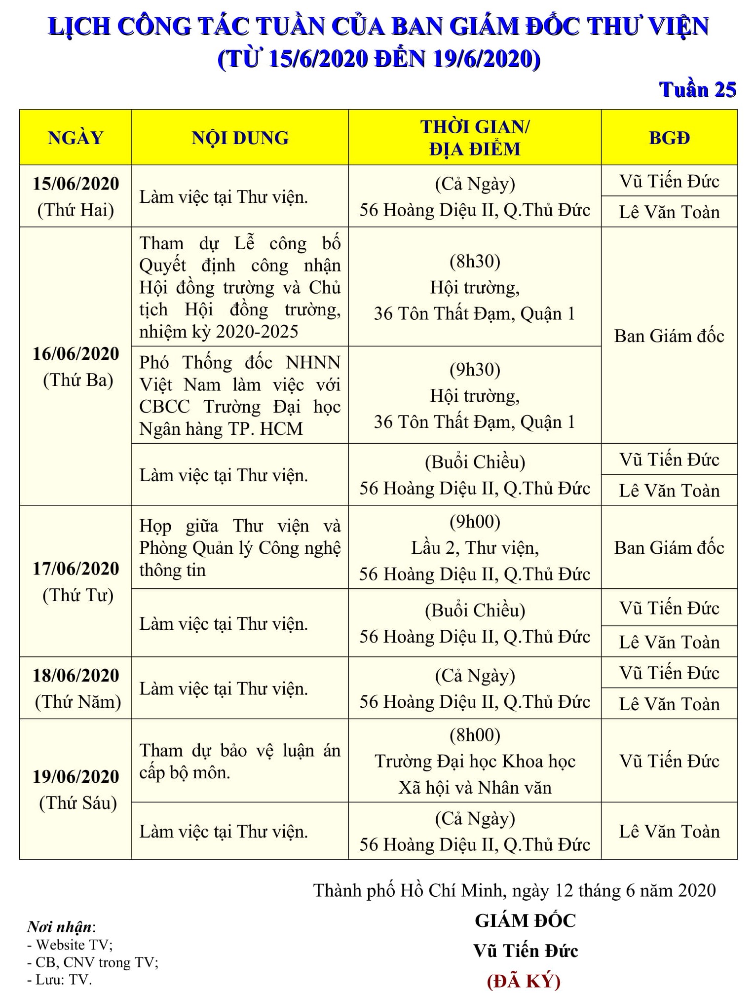 Lịch công tác tuần 25 của Ban Giám đốc Thư viện (từ 15/6/2020 đến 19/6/2020)