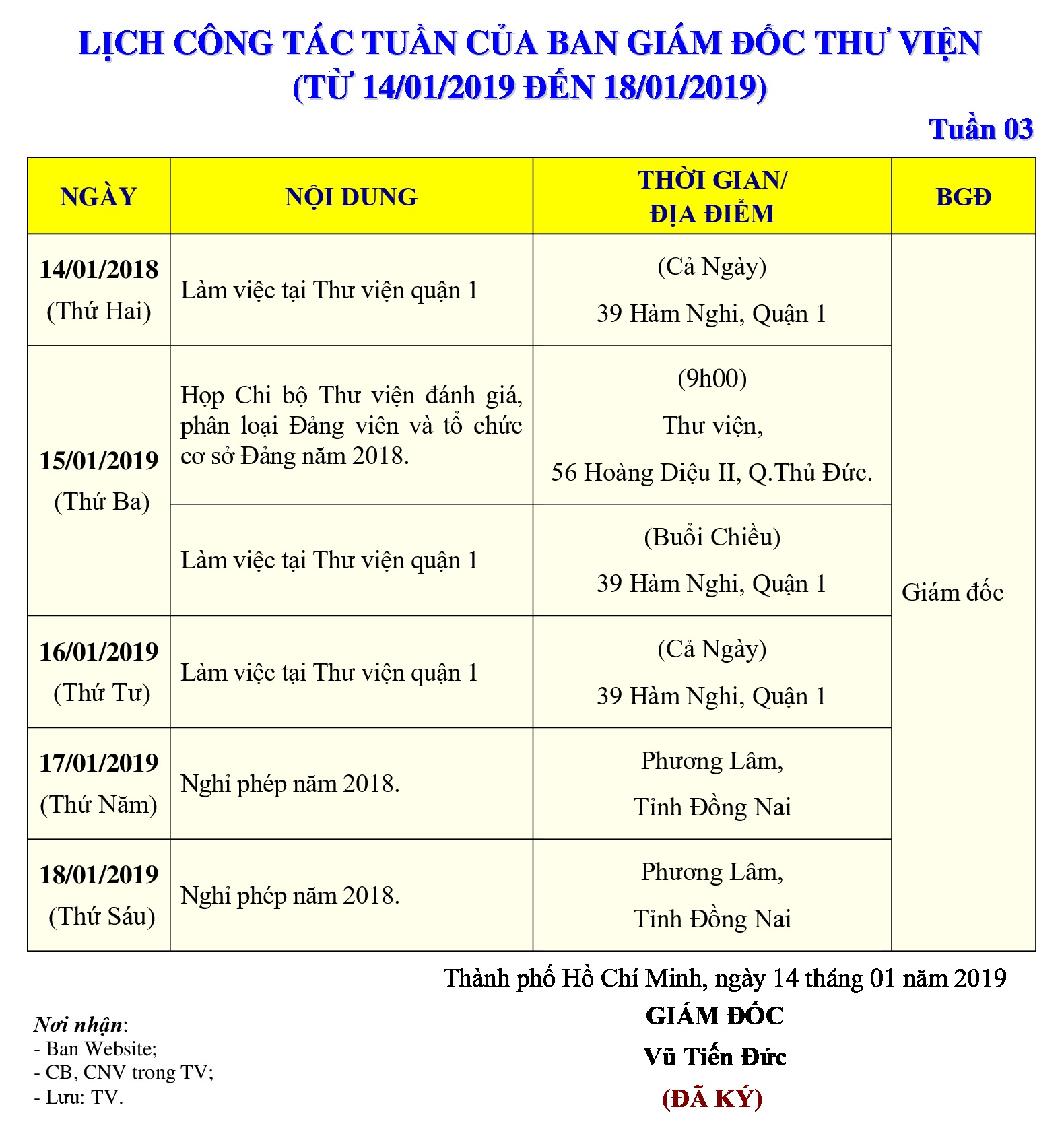 Lịch công tác tuần 03 của Ban Giám đốc Thư viện (từ 14/01/2019 đến 18/01/2019)