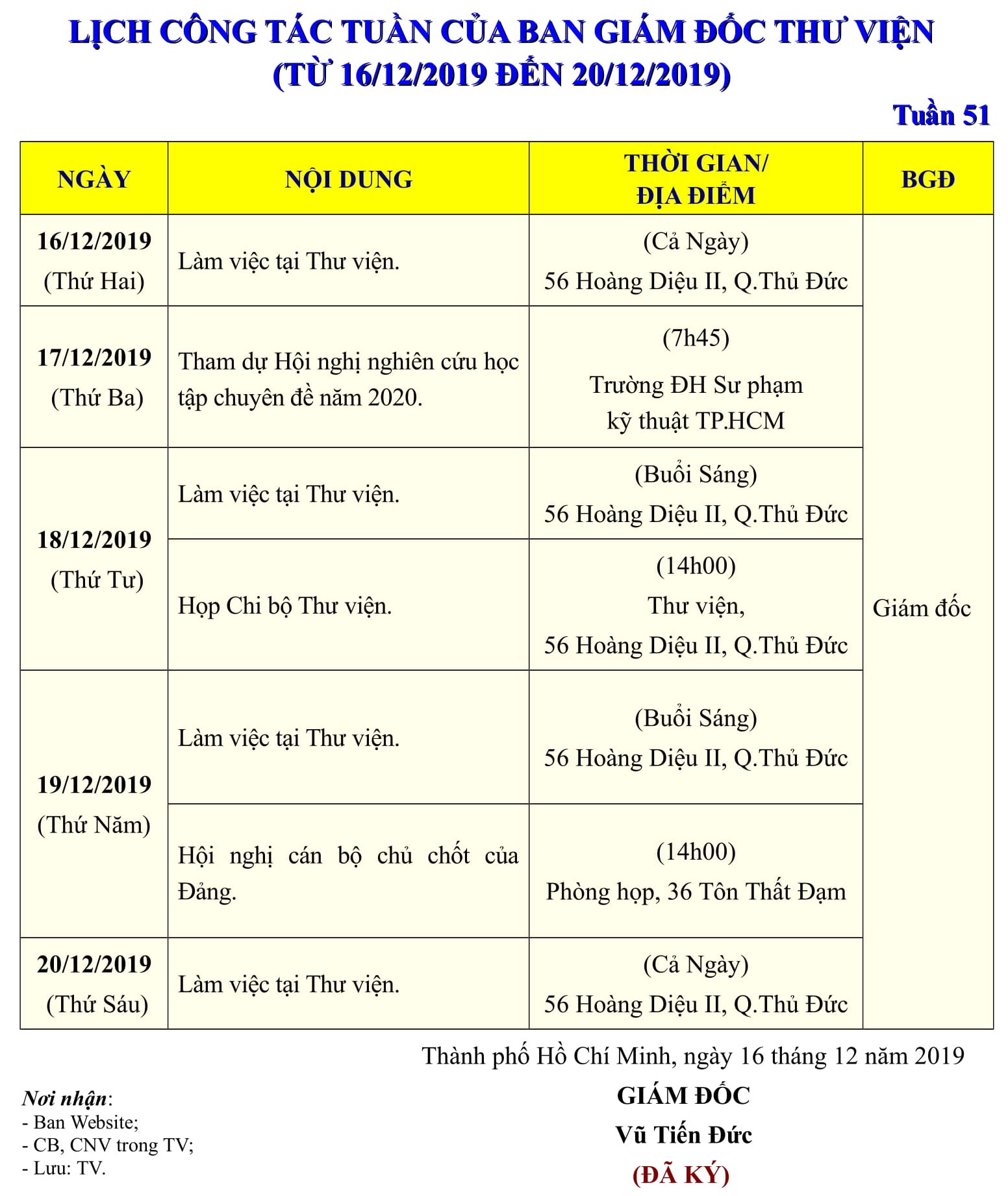 Lịch công tác tuần 51 của Ban Giám đốc Thư viện (từ 16/12/2019 đến 20/12/2019)