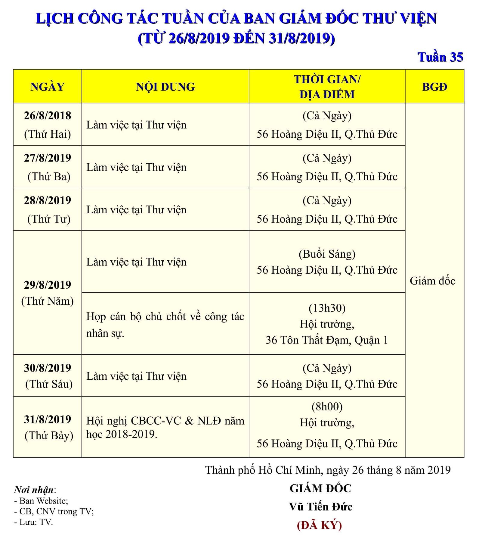 Lịch công tác tuần 35 của Ban Giám đốc Thư viện (từ 26/8/2019 đến 31/8/2019)