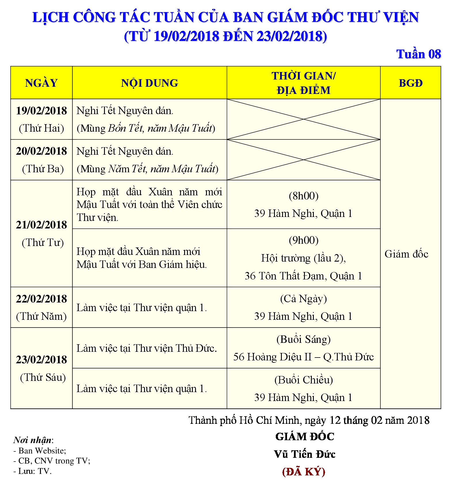 Lịch công tác tuần 08 của Ban Giám đốc Thư viện (từ 19/02/2018 đến 23/02/2018)