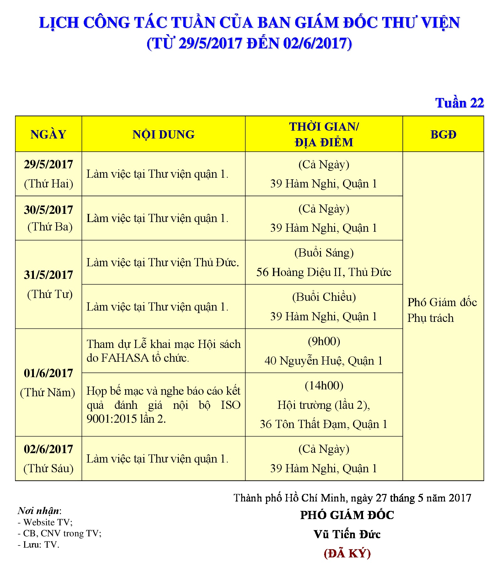 Lịch công tác tuần 22 của Ban Giám đốc Thư viện (từ 29/5/2017 đến 02/6/2017)