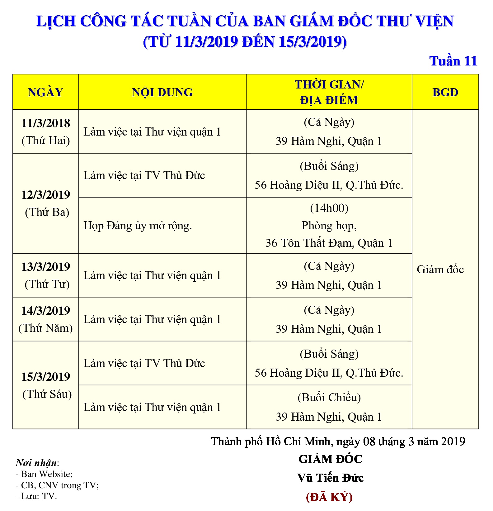 Lịch công tác tuần 11 của Ban Giám đốc Thư viện (từ 11/3/2019 đến 15/3/2019)