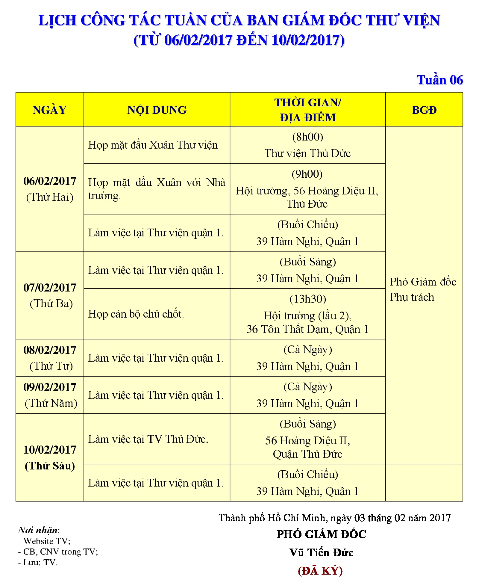 Lịch công tác tuần 06 của Ban Giám đốc Thư viện (từ 06/02/2017 đến 10/02/2017)