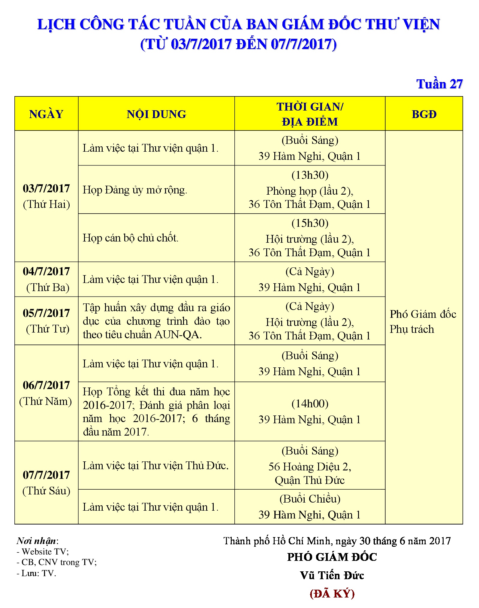 Lịch công tác tuần 27 của Ban Giám đốc Thư viện (từ 03/7/2017 đến 07/7/2017)