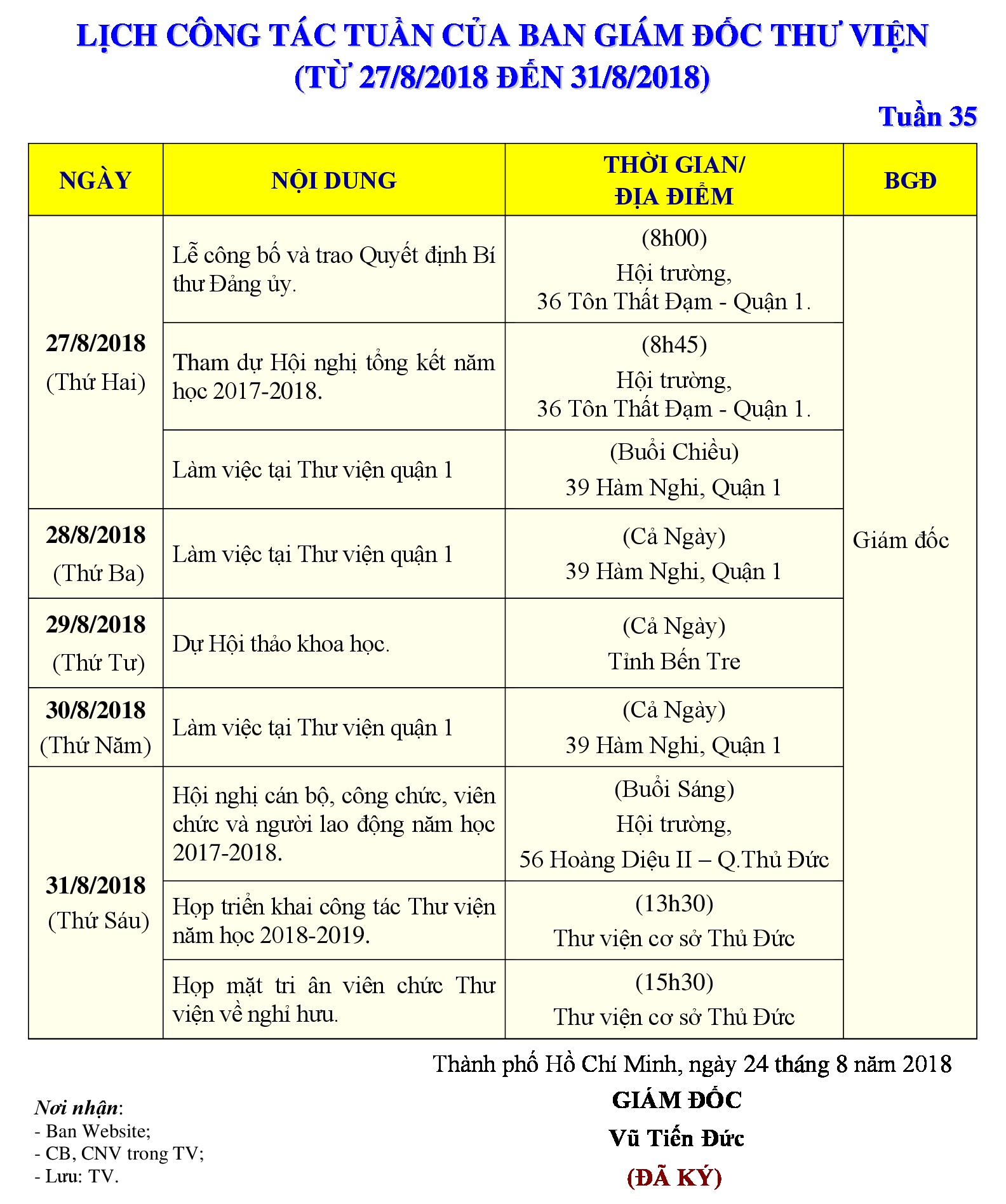 Lịch công tác tuần 35 của Ban Giám đốc Thư viện (từ 27/8/2018 đến 31/8/2018)
