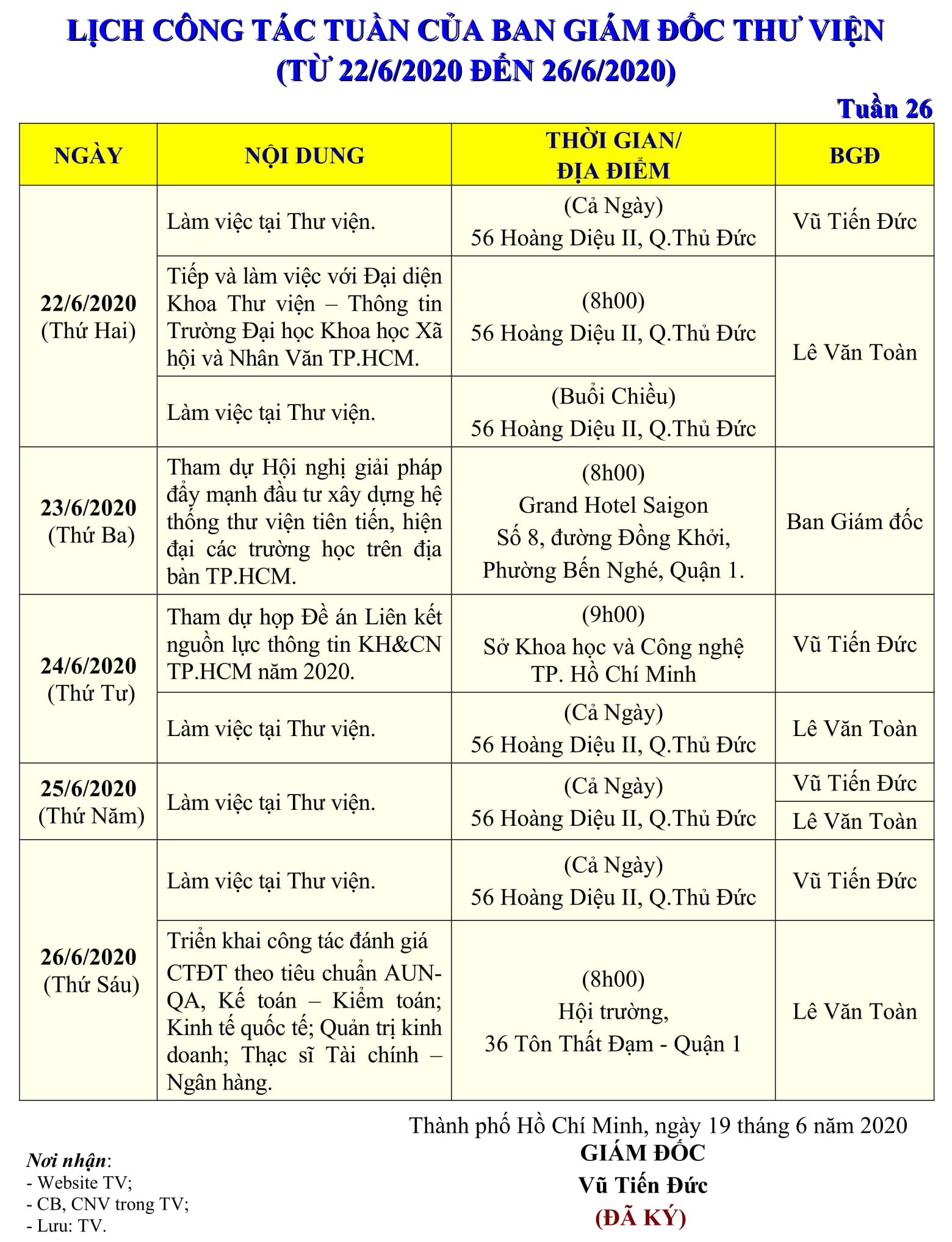 Lịch công tác tuần 26 của Ban Giám đốc Thư viện (từ 22/6/2020 đến 26/6/2020)