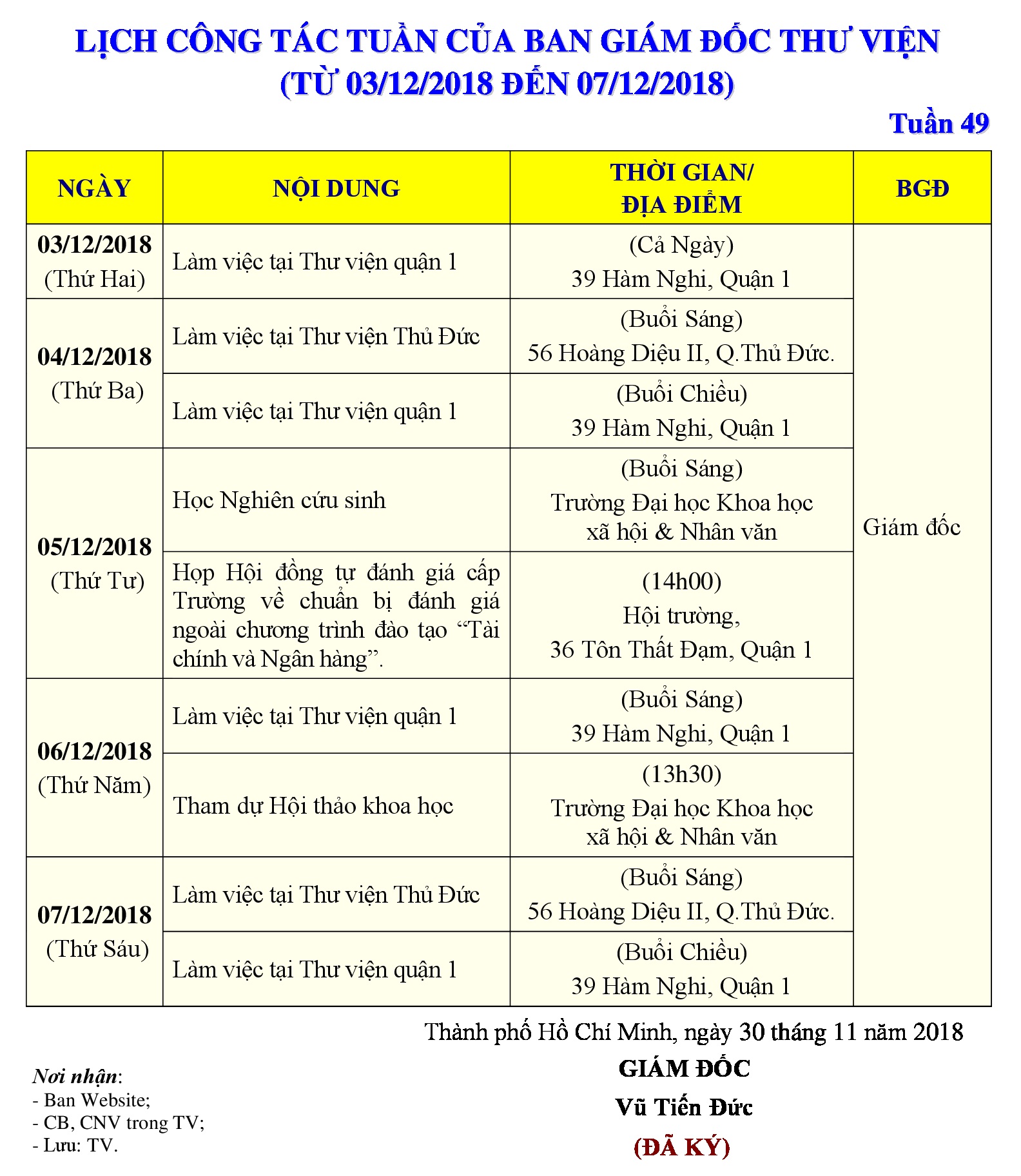 Lịch công tác tuần 49 của Ban Giám đốc Thư viện (từ 03/12/2018 đến 07/12/2018)