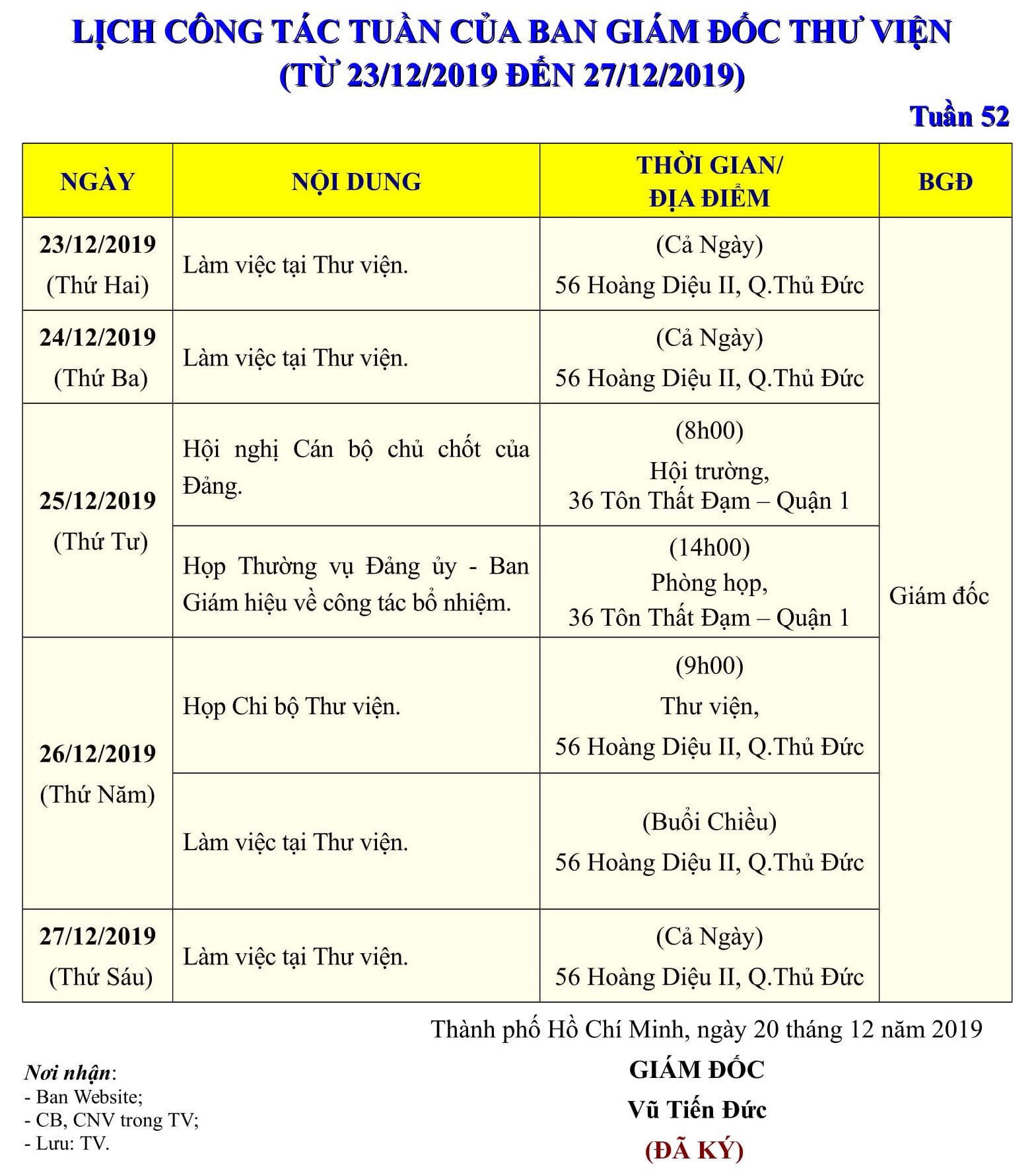 Lịch công tác tuần 52 của Ban Giám đốc Thư viện (từ 23/12/2019 đến 27/12/2019)