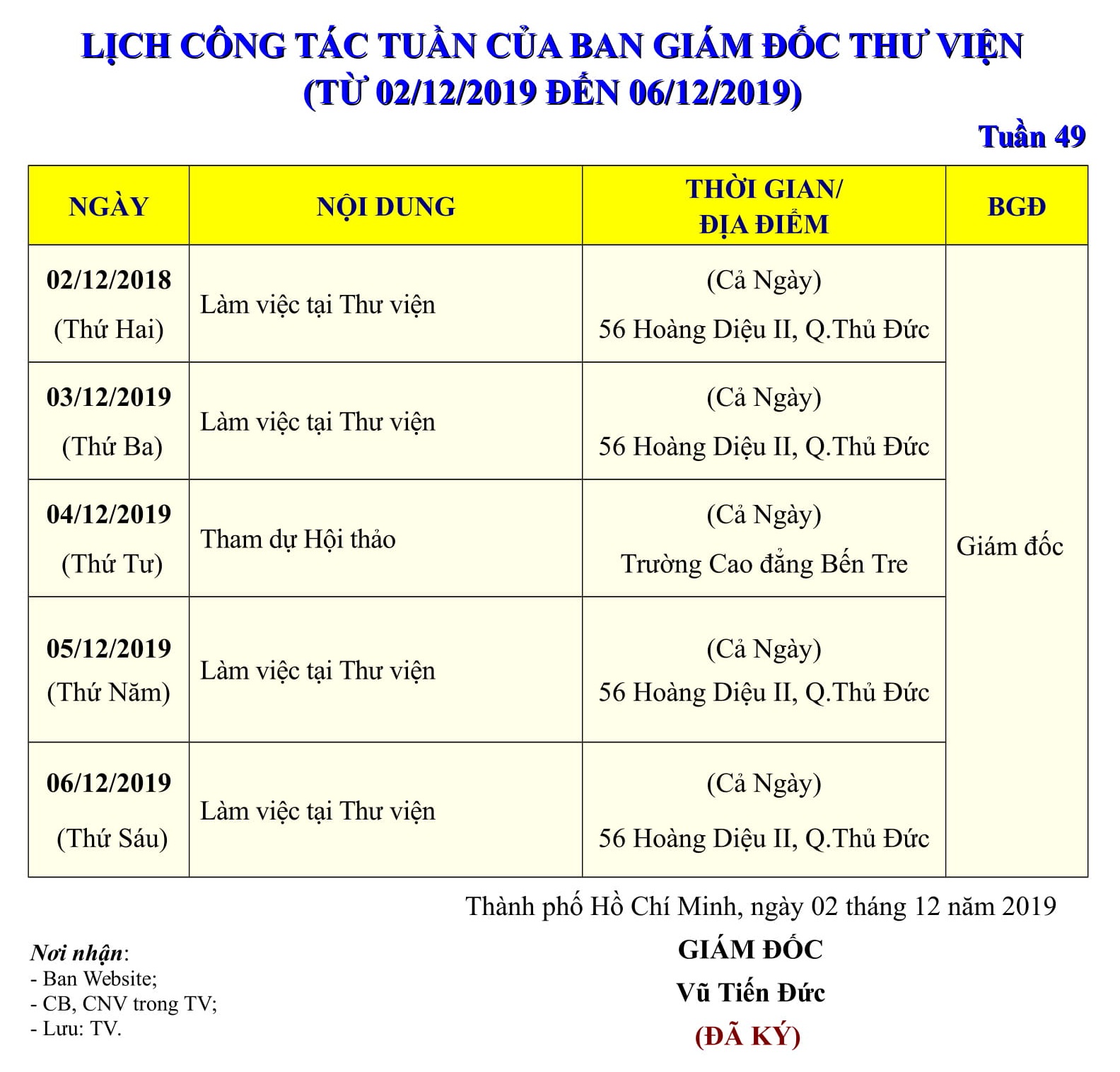 Lịch công tác tuần 49 của Ban Giám đốc Thư viện (từ 02/12/2019 đến 06/12/2019)