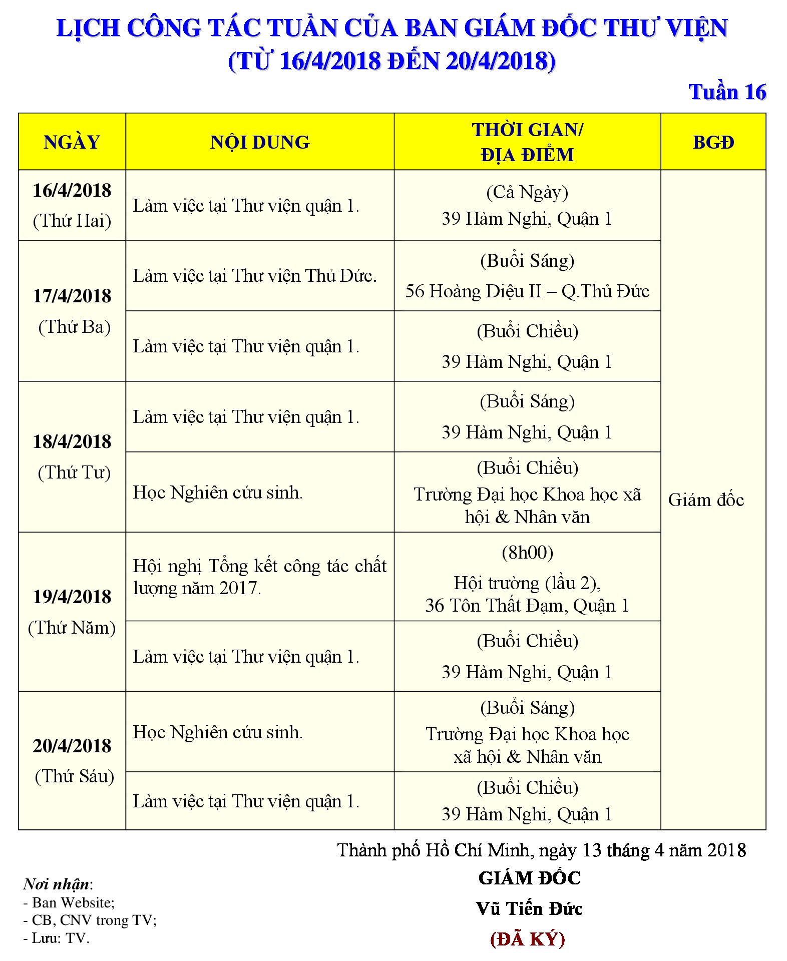 Lịch công tác tuần 16 của Ban Giám đốc Thư viện (từ 16/4/2018 đến 20/4/2018)