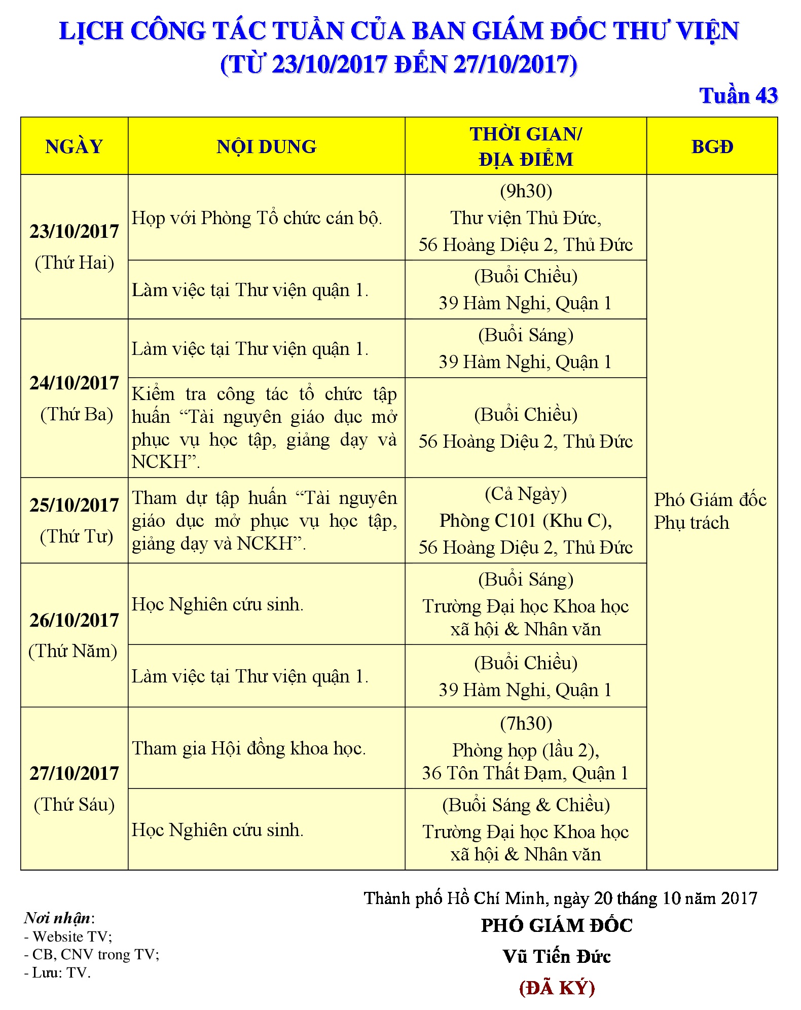 Lịch công tác tuần 43 của Ban Giám đốc Thư viện (từ 23/10/2017 đến 27/10/2017)