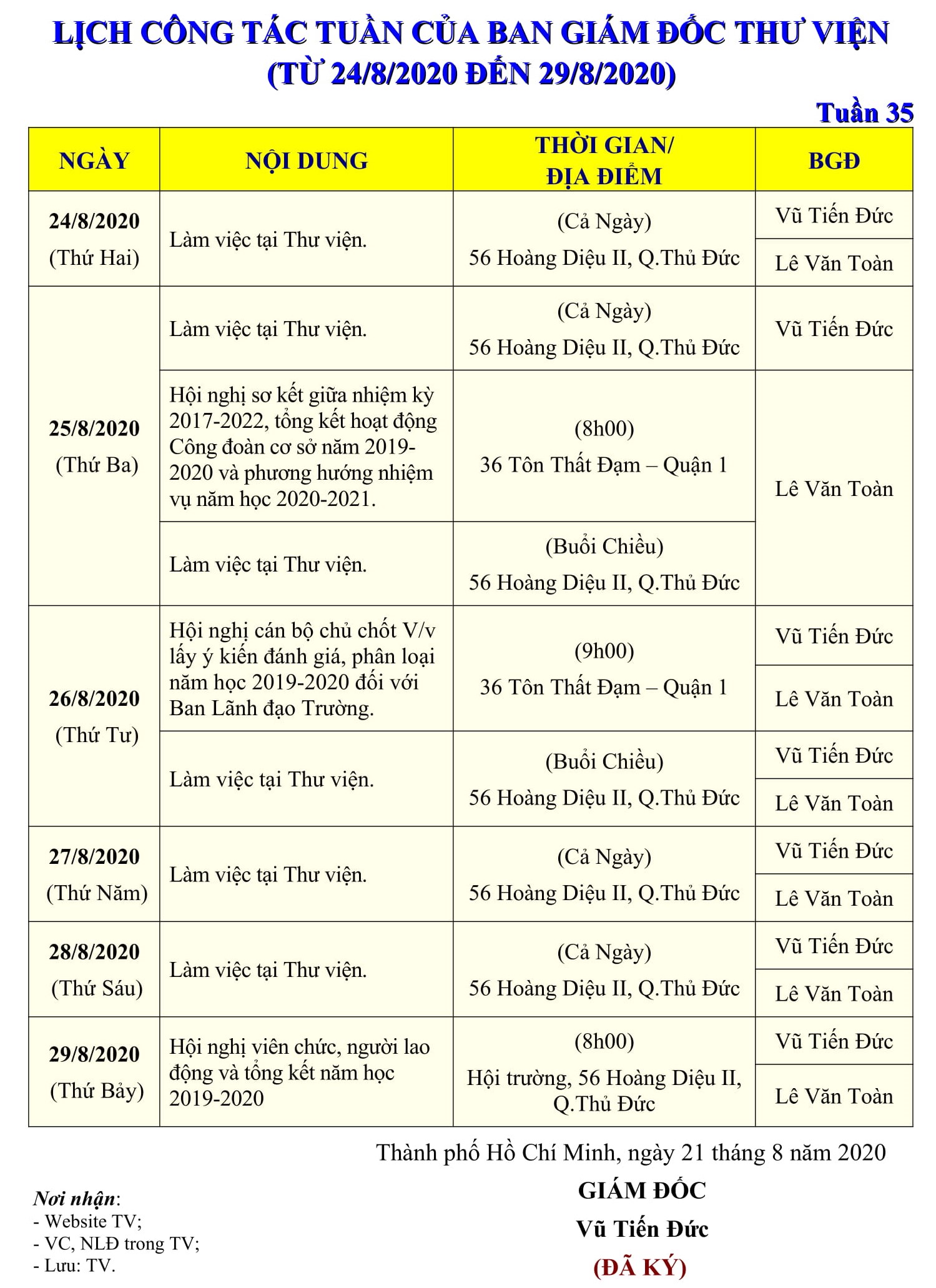 Lịch công tác tuần 35 của Ban Giám đốc Thư viện (từ 24/8/2020 đến 29/8/2020)