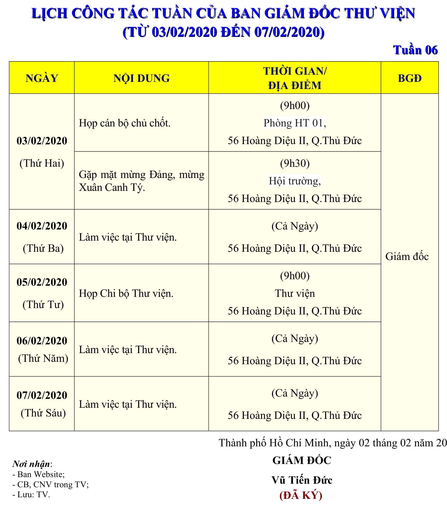 Lịch công tác tuần 06 của Ban Giám đốc Thư viện (từ 03/02/2020 đến 07/02/2020)