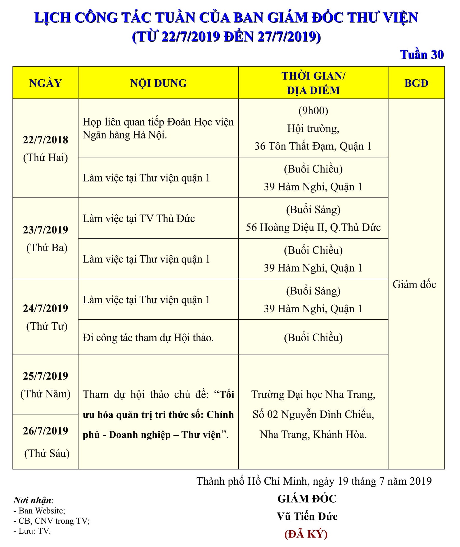 Lịch công tác tuần 30 của Ban Giám đốc Thư viện (từ 22/7/2019 đến 27/7/2019)
