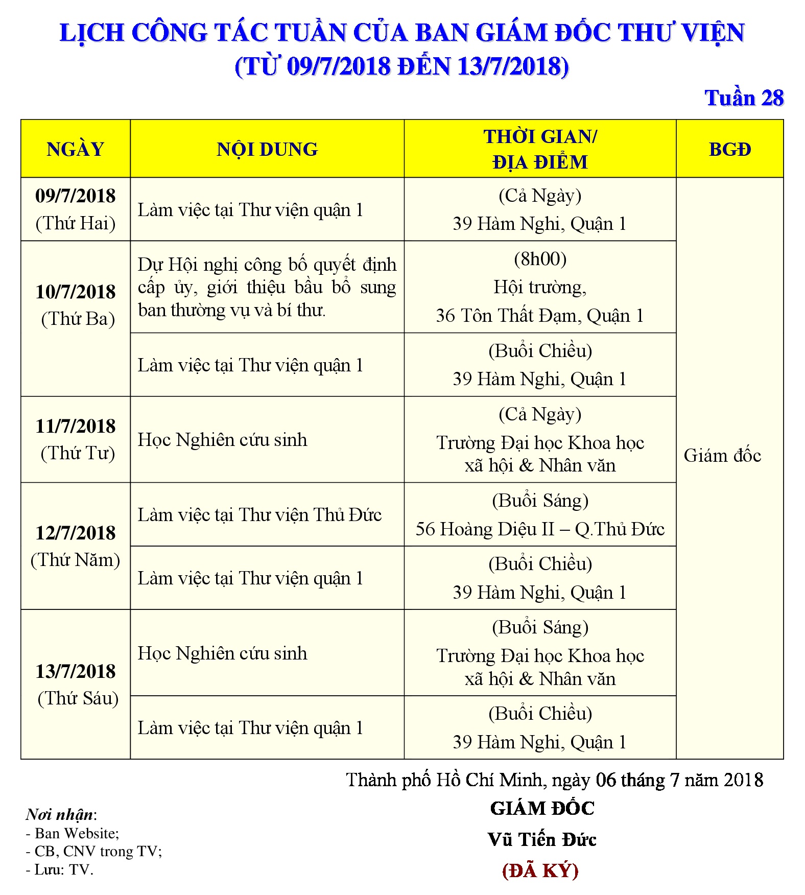 Lịch công tác tuần 28 của Ban Giám đốc Thư viện (từ 09/7/2018 đến 13/7/2018)