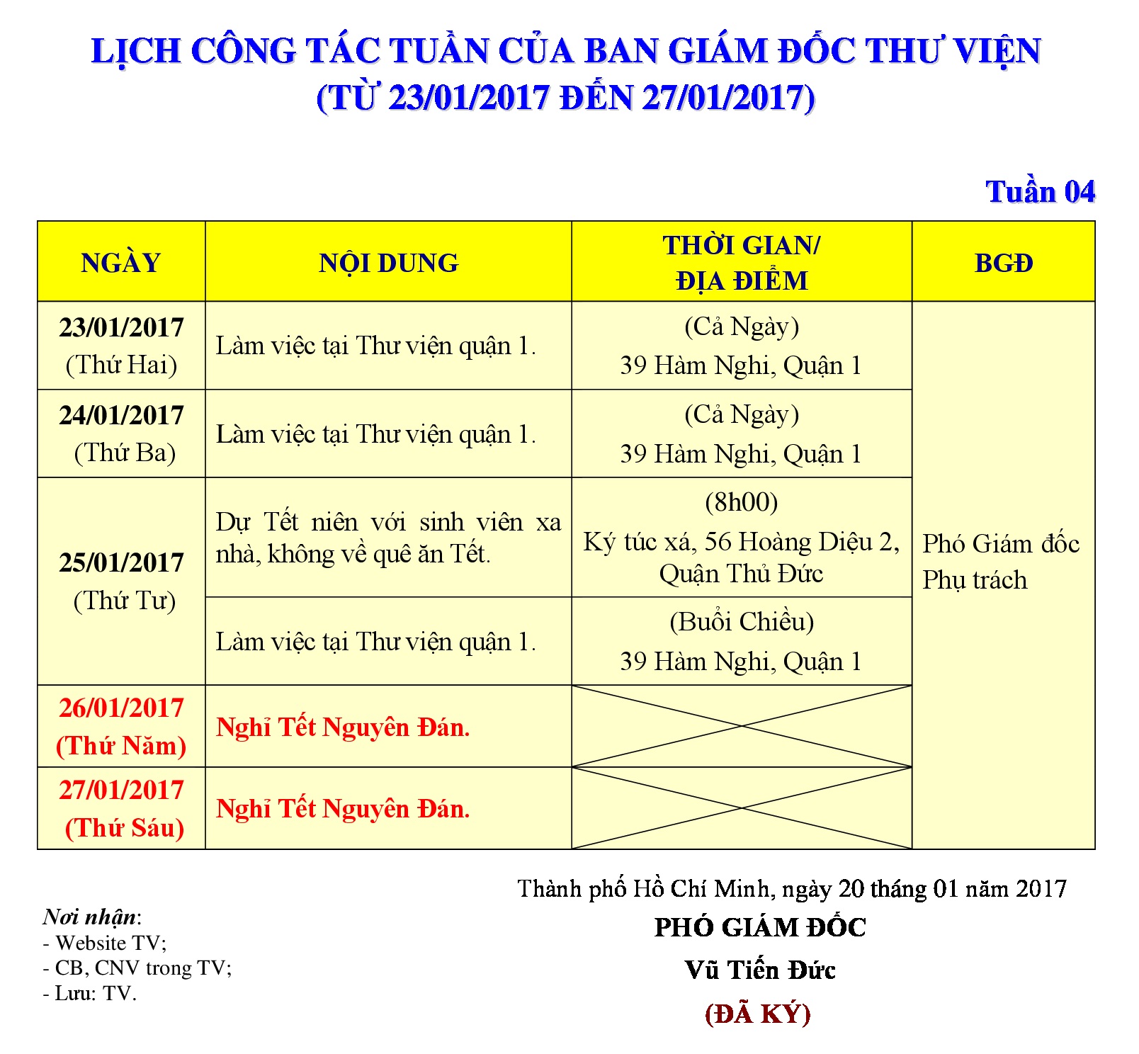 Lịch công tác tuần 04 của Ban Giám đốc Thư viện (từ 23/01/2017 đến 27/01/2017)