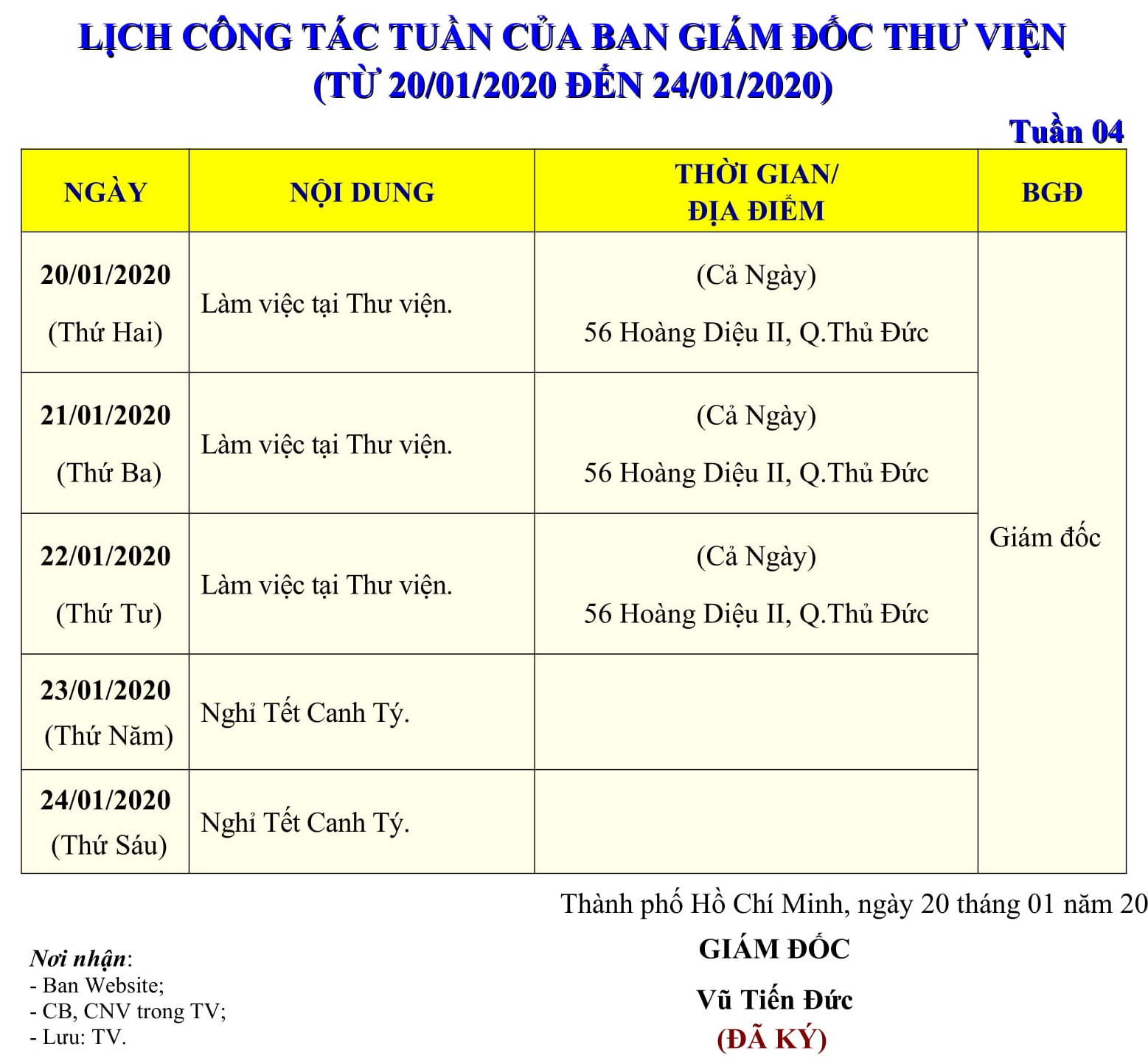 Lịch công tác tuần 04 của Ban Giám đốc Thư viện (từ 20/01/2020 đến 24/01/2020)