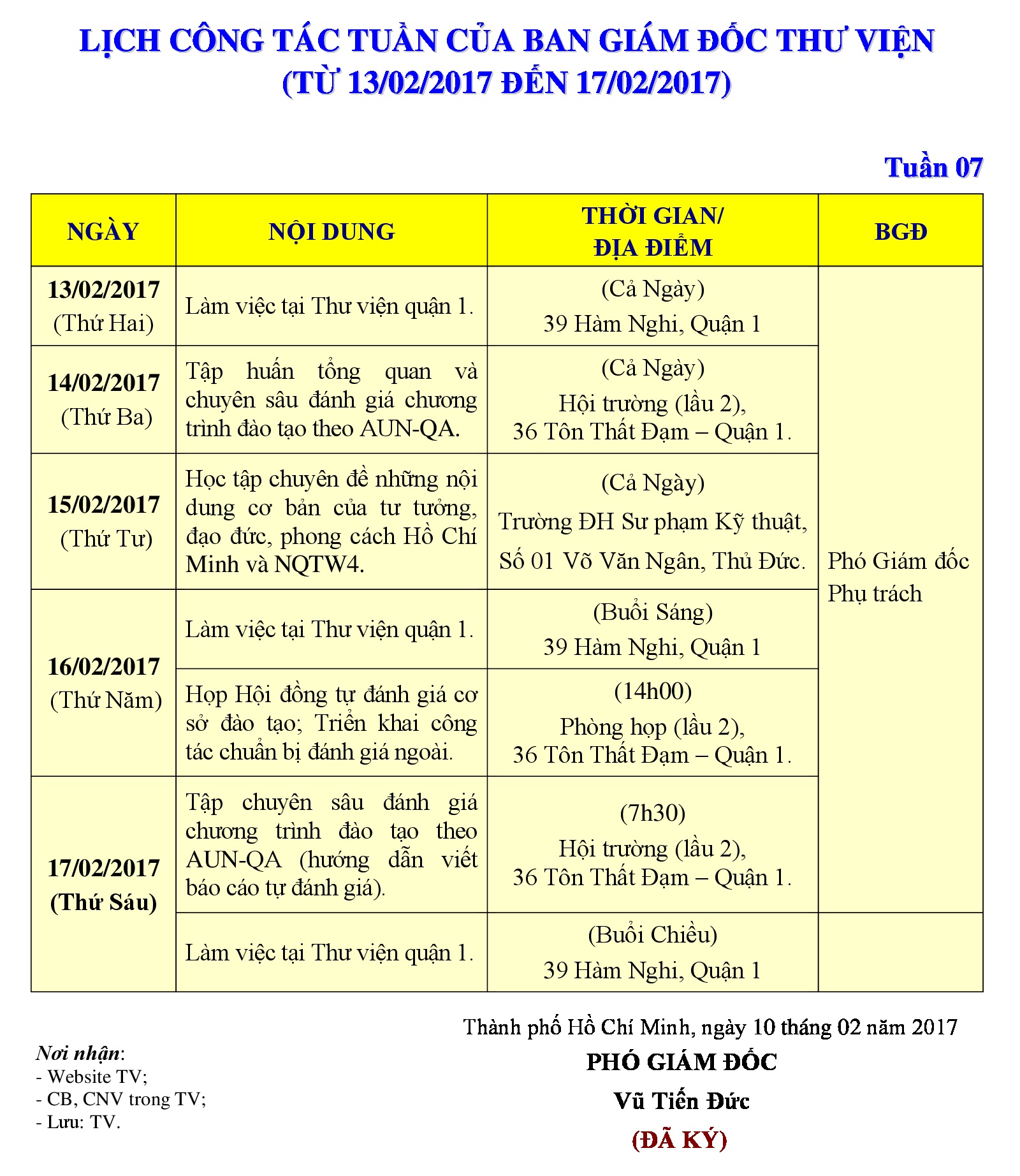 Lịch công tác tuần 07 của Ban Giám đốc Thư viện (từ 13/02/2017 đến 17/02/2017)