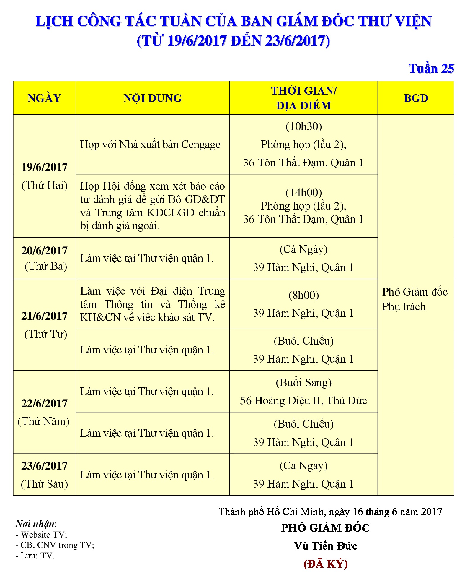 Lịch công tác tuần 25 của Ban Giám đốc Thư viện (từ 19/6/2017 đến 23/6/2017)