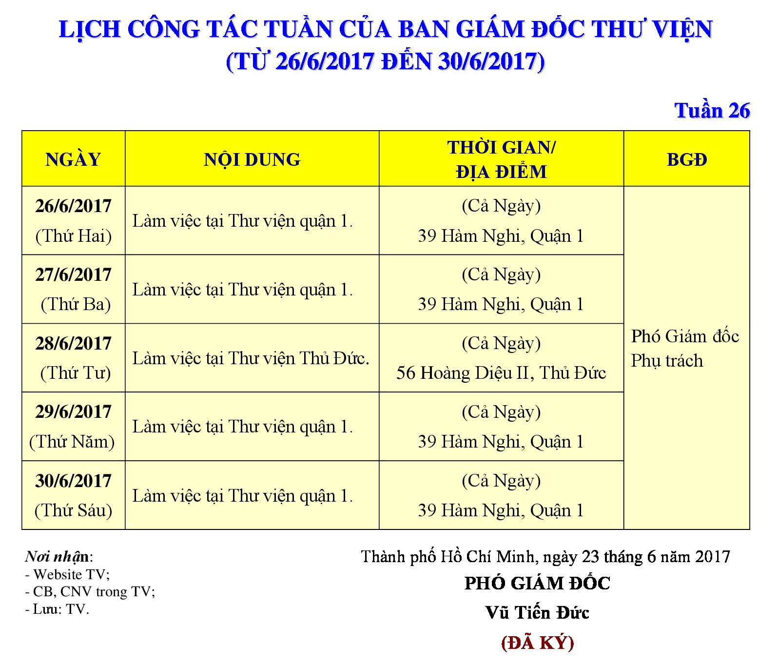 Lịch công tác tuần 26 của Ban Giám đốc Thư viện (từ 26/6/2017 đến 30/6/2017)