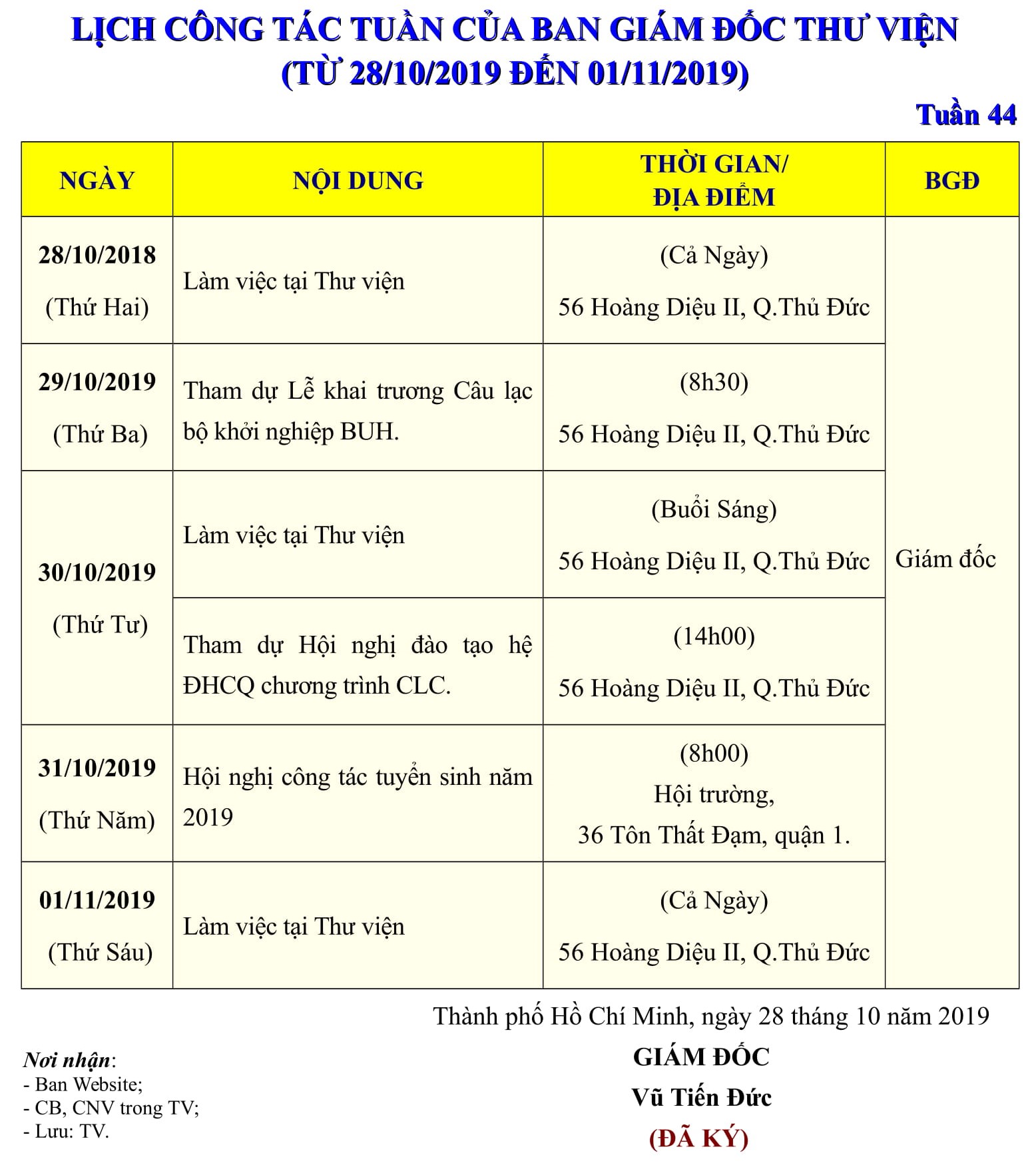 Lịch công tác tuần 44 của Ban Giám đốc Thư viện (từ 28/10/2019 đến 01/11/2019)