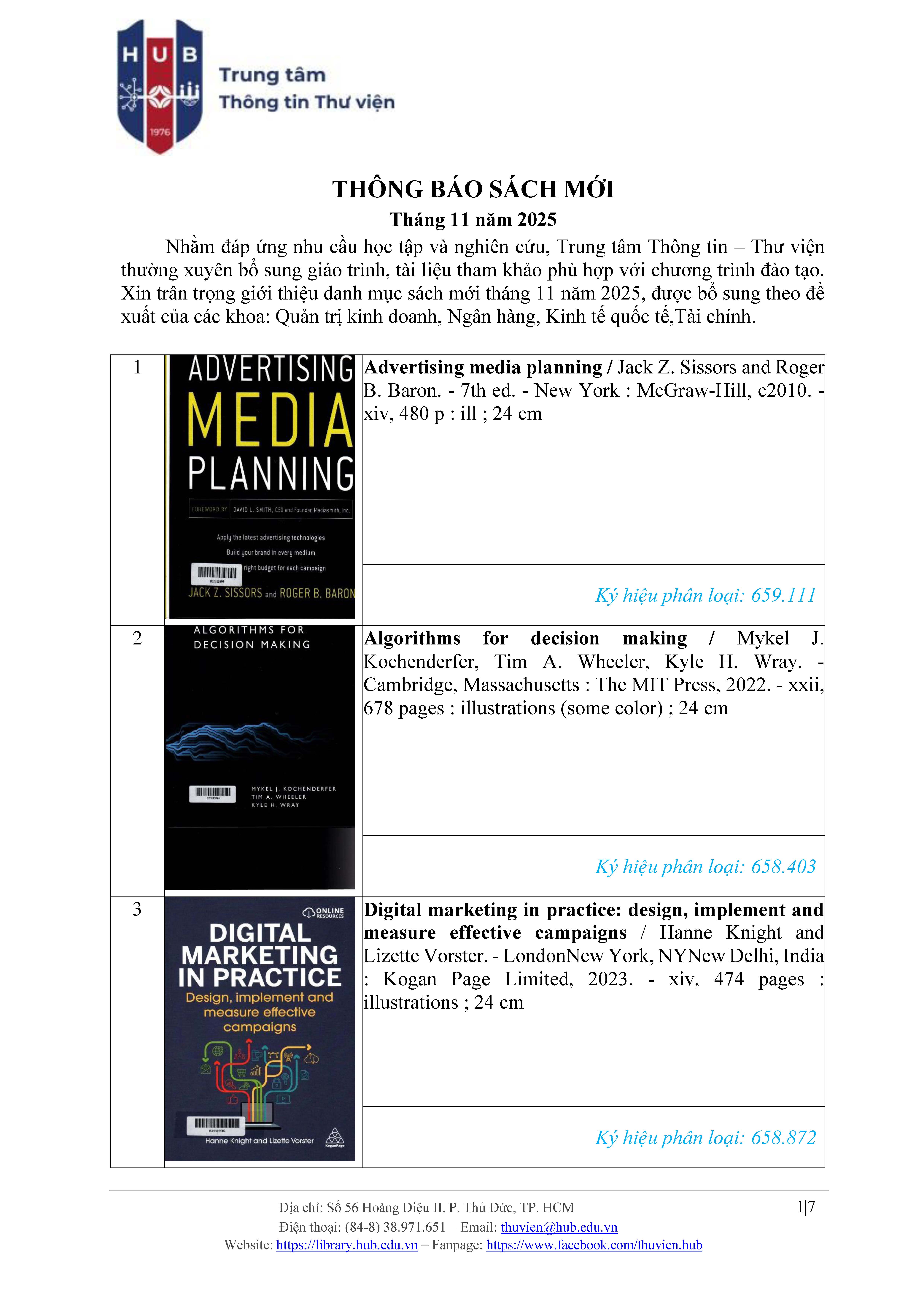 Thực hiện duy trì công tác đảm bảo chất lượng hoạt động đào tạo và nghiên cứu khoa học, Trung tâm Thông tin - Thư viện Trường Đại học Ngân hàng Tp.HCM thường xuyên bổ sung giáo trình, tài liệu tham khảo mới, phù hợp với đề cương môn học của các chương trình đào tạo hiện hành. Xin trân trọng thông báo đến Quý bạn đọc danh mục sách mới được cập nhật trong tháng 11/2025.Các tài liệu được bổ sung theo đề xuất của các Khoa/Viện: 1. Sách mới về các công nghệ nền tảng hiện nay. 2. Quản trị kinh doanh, Ngân hàng, Kinh tế quốc tế,Tài chính