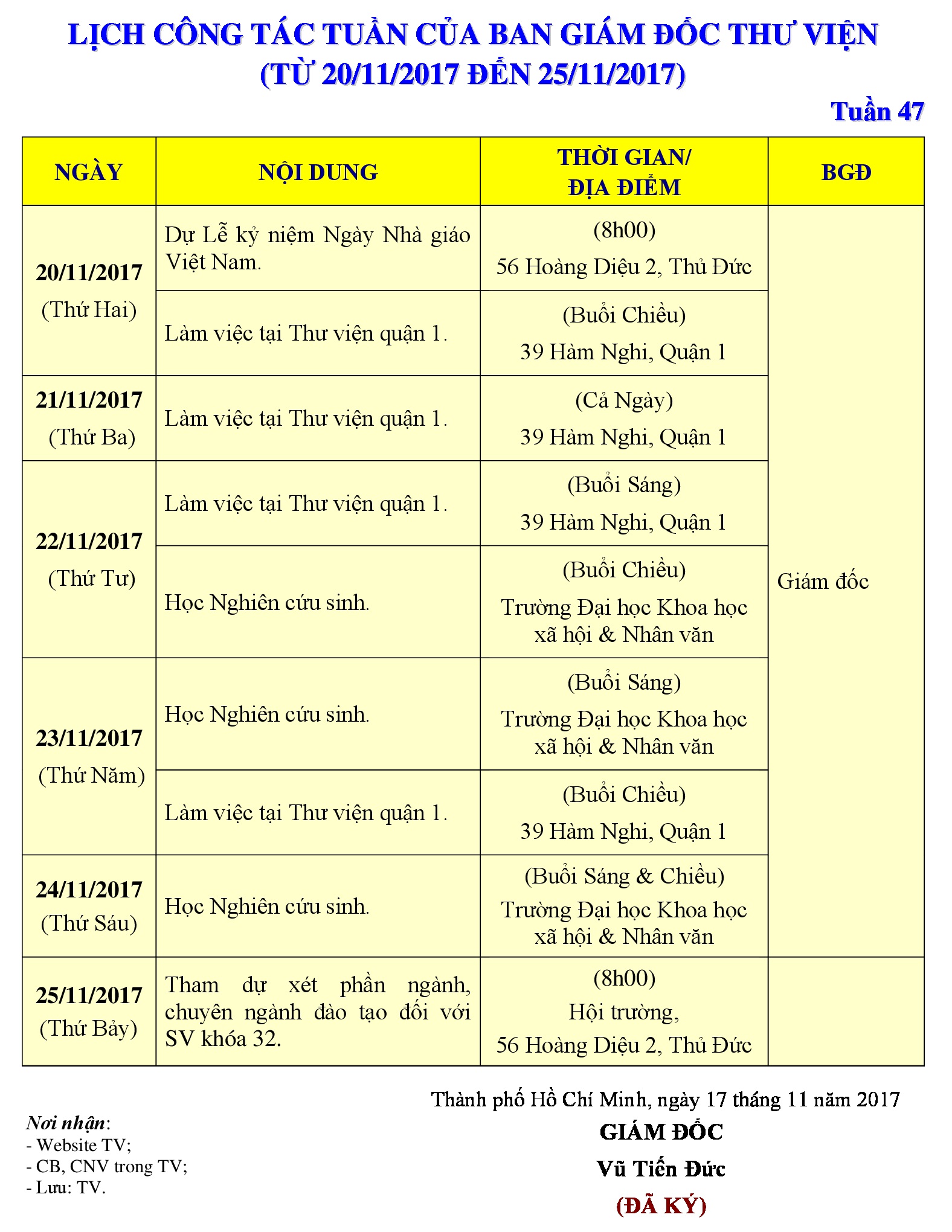 Lịch công tác tuần 47 của Ban Giám đốc Thư viện (từ 20/11/2017 đến 25/11/2017)