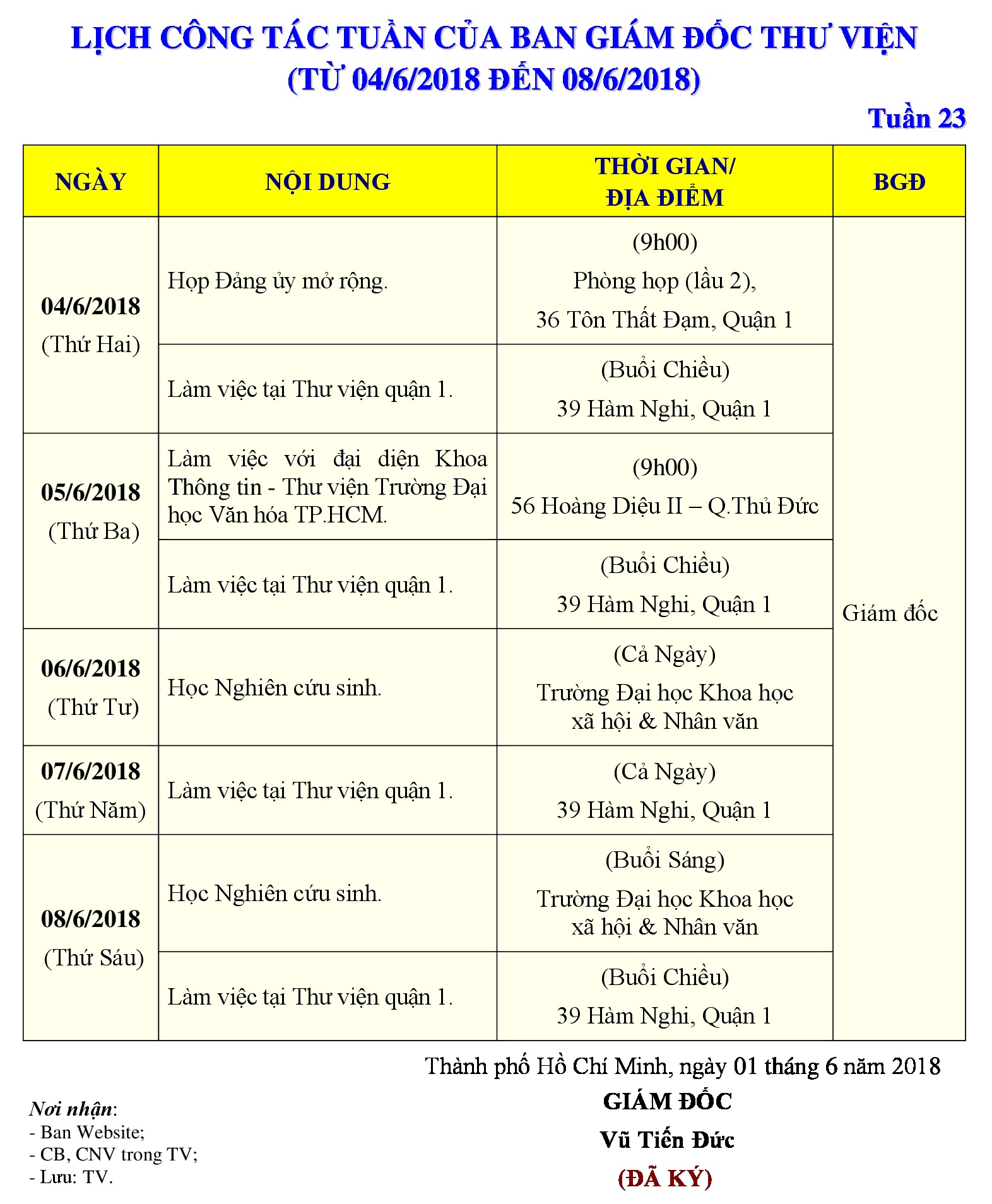 Lịch công tác tuần 23 của Ban Giám đốc Thư viện (từ 04/6/2018 đến 08/6/2018)