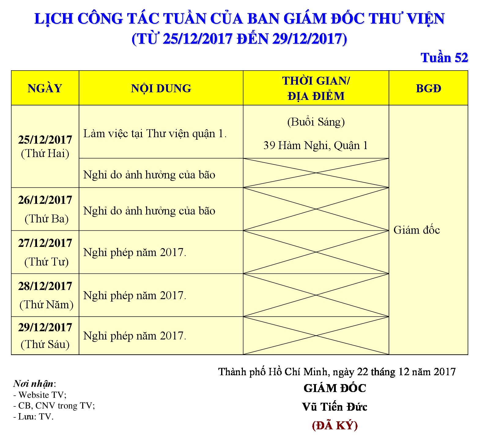 Lịch công tác tuần 52 của Ban Giám đốc Thư viện (từ 25/12/2017 đến 29/12/2017)