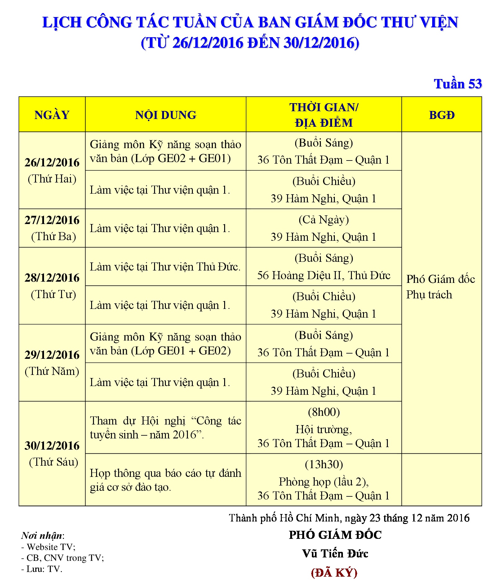 Lịch công tác tuần 53 của Ban Giám đốc Thư viện (từ 26/12/2016 đến 30/12/2016)