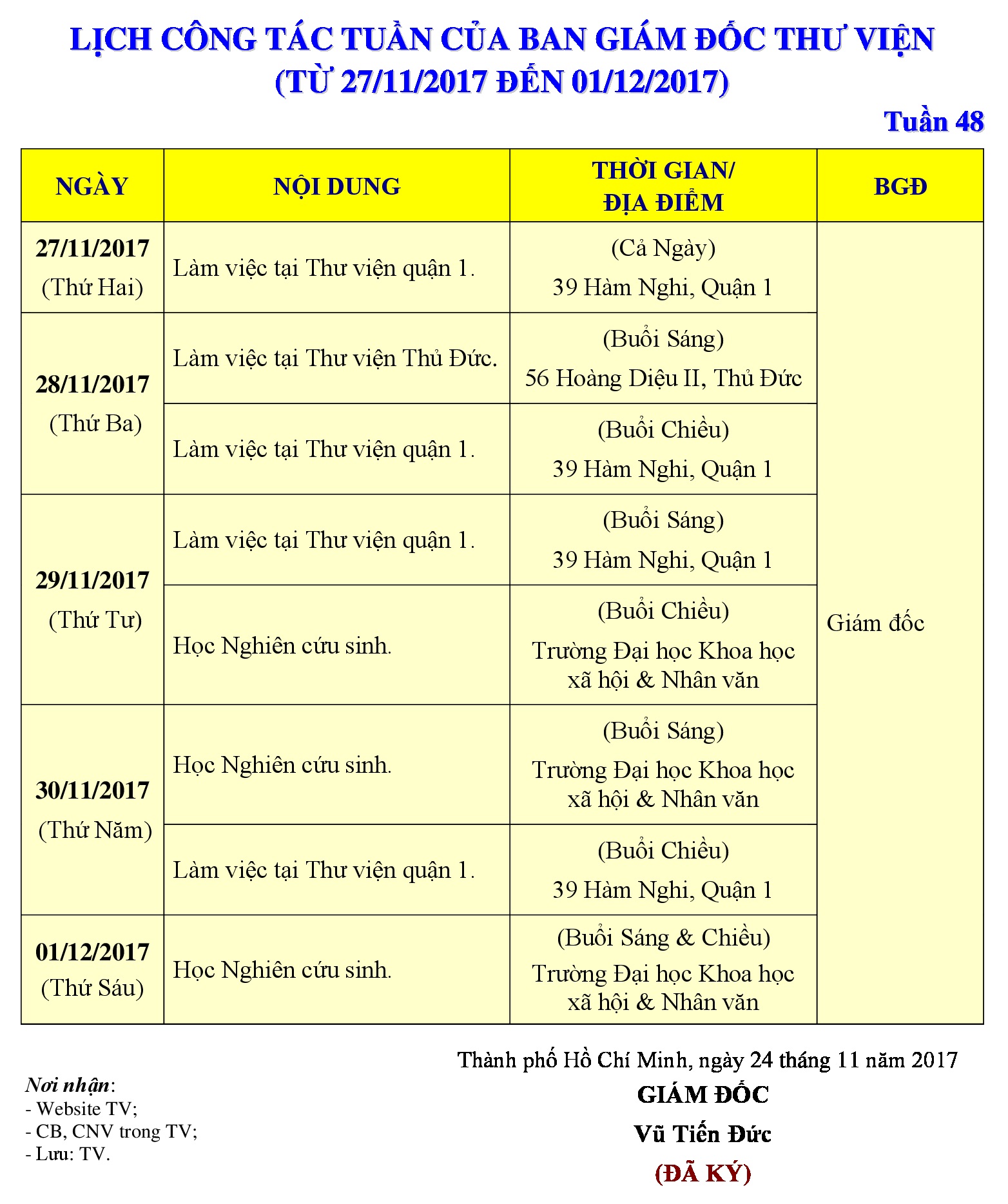 Lịch công tác tuần 48 của Ban Giám đốc Thư viện (từ 27/11/2017 đến 01/12/2017)